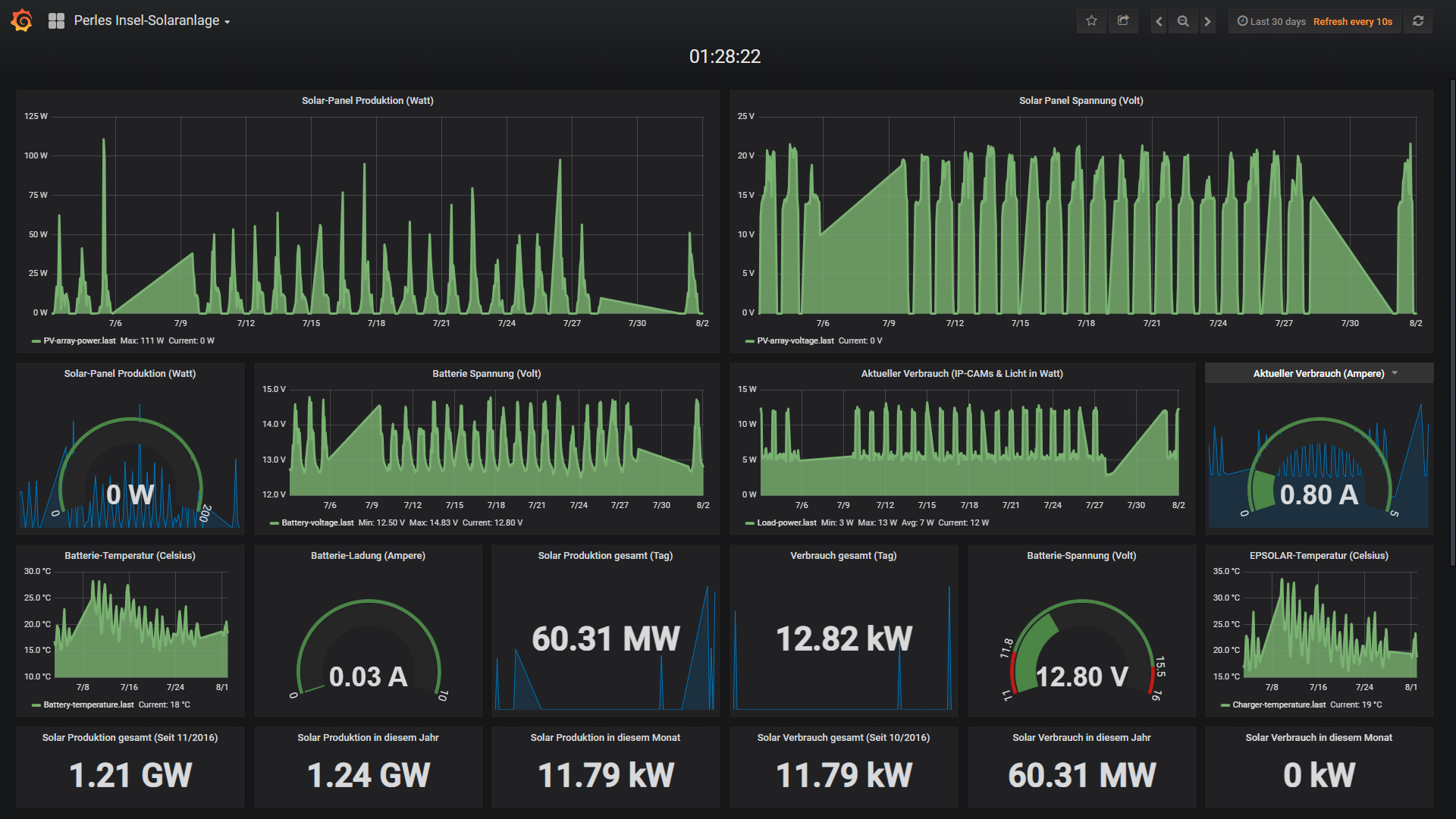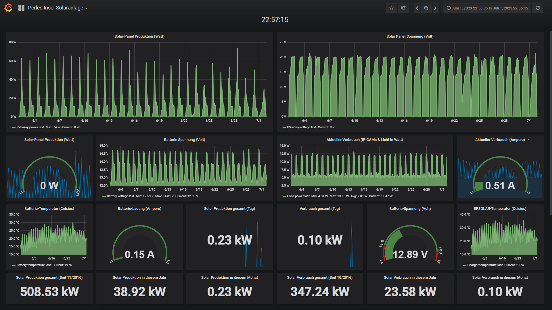 Die kleine 200 Watt Insel-Solaranlage: Natürlich hatte auch die Insel-Solaranlage keine probleme die Akkus bei den sehr langen Juli-Tagen RuckZuck wieder zu füllen. Aus mir nicht erklärlichen Gründen hatte sich der Raspberry Pi der nun seit 7 Jahren 24/7 läuft und fleisst Daten loggt 2mal veranschiedet. Eigentlich aber auch nicht, denn der Pi funktioniert. Einmal schein sich der COM-Port des EPEVER Solarregeler aufgehangen zu haben und das zweite mal gab es ein Problem mit dem Voll-Backup der 32Gb Speicherkarte. Da dieses gepackt in meinen NAS-Server übertragen wird war vor 2 Jahren der Datenumfang um die 2GB gross. Mittlerweile hat sich die Datenbank mit Daten der letzten 7 Jahre auf gepackt >6GB aufgebläht. Eine Herausforderung für den kleinen PI denn die WLAN Verbindung draussen zu meinem Router innen ist schwach und manchmal etwas wchaelig. Somit kann sich so ein Backup also auch mal 10-12 Stunden ziehen in den der Raspberry PI nichts anders macht als das Voll-Backup auf das NAS zu schaufeln. Und bei einer solchen Aktion hat sich der PI scheinbar nach 14 Stunden aufgehängt. Nach einem kurzen Neustart bei beiden Szenarien lief dann wieder alles. Das ganze hatte natürlich keinen technischen Einfluss auf die Insel-Anlage. Diese funktioniert seit Inbetriebnahme absolut Fehlerfrei. Aber der Datenlogger macht mir langsam etwas sorgen, denn die Datenbank mit allen Daten der letzten 7 Jahre hat mittlerweile eine Groesse angenommen die schwierig per WLAN zu übertragen ist. Insbsondere auch deswegen weil die WLAN-Verbindung in der Regel sehr schwach ist. Vielleicht werde ich in den kommenden Monaten die Datenbank mal löschen müssen um das System zu entschlacken. Mich selbst interessieren eigentlich nur die Daten der letzten 30 Tage. Cool ist natuerich auch das man die Möglichkeit hat zu schauen was vor 7 Jahren in den 30 Tagen los war. Etwas ungünstig war natürlich, dass solche Ausfälle immer dann stattfinden wenn ich in Deutschland unterwegs bin und aus der Ferne nichts machen kann da ich vor Ort die Stromversorgung des Systems kurz kappen muss um wieder alles zum laufen zu bringen (zickigen Com-Port des Ladereglers zurück setzen oder PI). Zum Glück passiert das nicht ganz so häufig, aber was die Backups angeht passiert es immer öfters das diese aufgrund der gigantischen Datenmassen nicht korrekt durchgeführt werden. ich beobachte die Situation weiterhin aufmerksam.