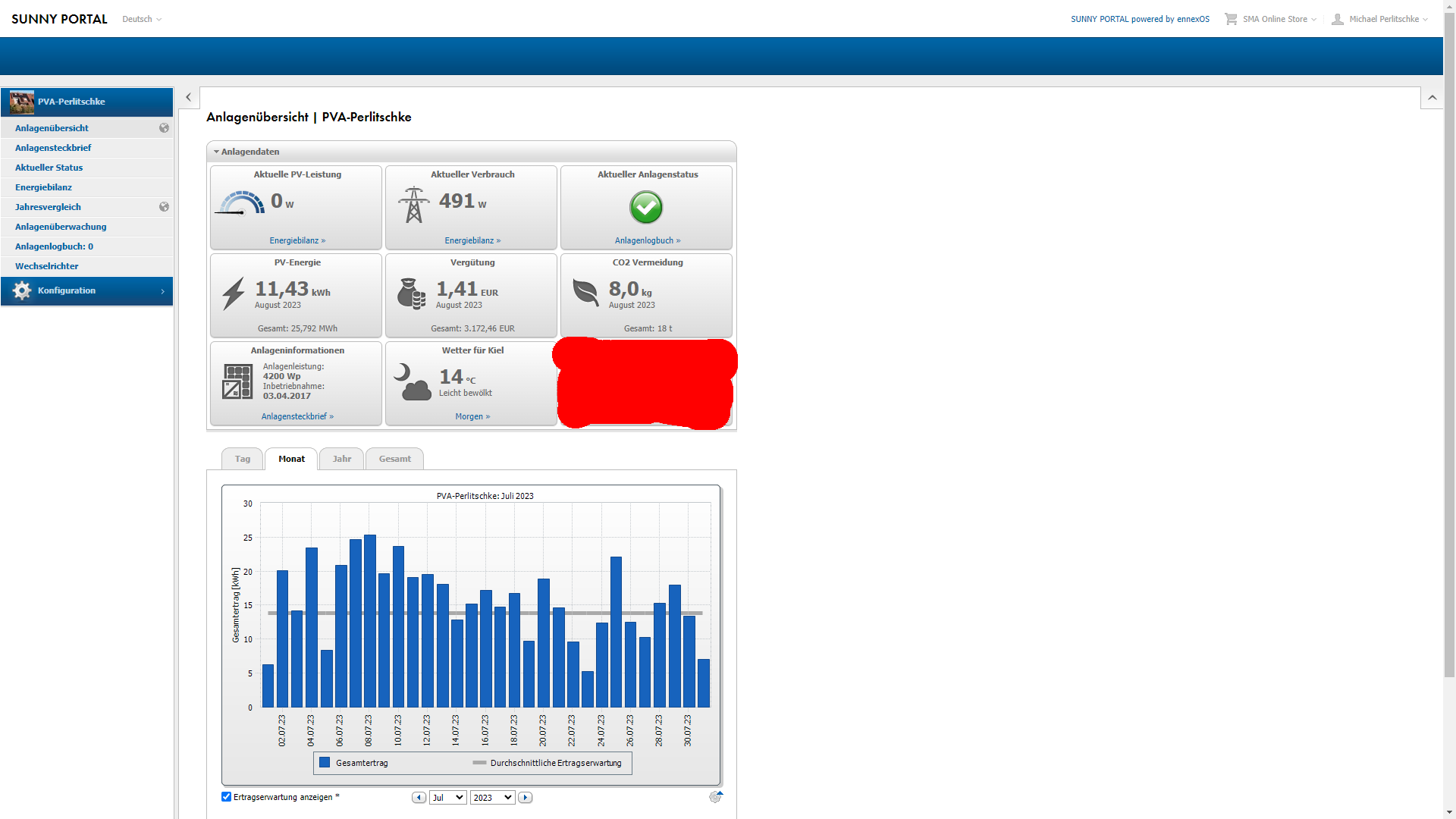 Hier die 4.2kwp Photovoltaik-Anlage auf dem Dach: Nun kommen wir zur kleinen 4,2kwp Dach PV Anlage und dem Juli-Ertrag, der durchaus in anbetracht des doch etwas durchwachsenen Wetters etwas Anlass zur Kritik gibt. Wie schon oben im Wetter-Update für den Juli berichtet war zu erwarten das dieser Juli für die PV-Dachanlage ein nicht ganz so tolles Ergebnis liefern wird. Die Ertragserwartung für den Juli lag bei 427,33kwh und vom Dach kamen nur 488,53kwh. Das ist seit Inbetriebnahme 2017 das schlechteste Juli-Ergebnis. Verrückte Welt, letzten Monat produzierte die Anlage einen neuen Rekord und diesen Monat nun genau das Gehenteil. Dennoch wurde die Ertragserwartung übertroffen. Immerhin! Das entspricht diesen Monat nur ein mageres Plus von 14,3% gegenüber der Ertragserwartung. Dieser Juli hat alle Erwartungen nach unten hin durchbrochen, denn das war so geseghen eher schlecht:
