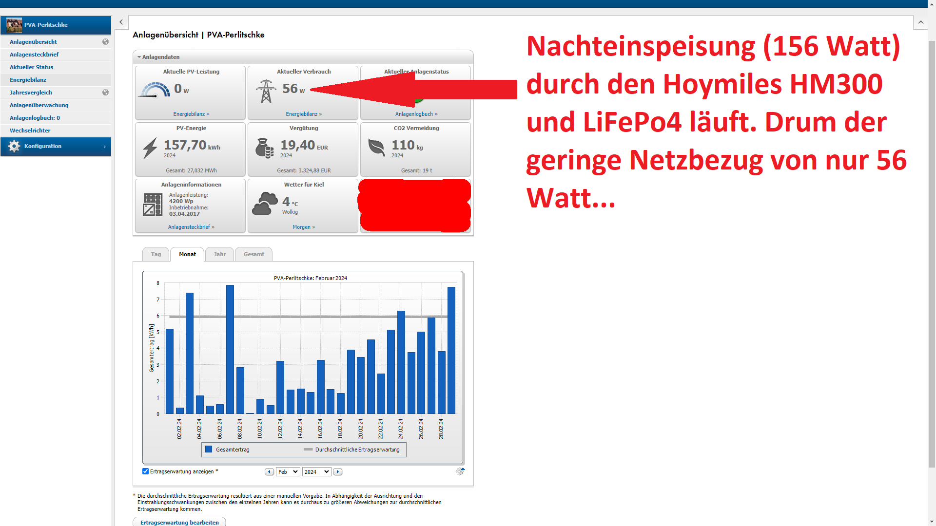 2,7kwh LiFePo4 Speicher und Selbstbau-Konstanteinspeisung: Hier standen auch wieder div. Optimierungen an der Anlage an. Eingerüstet wurde ein rechtlich konformer Hoymiles HM300 300 Watt Einspeisewechselrichter der allerdings eine Minimalspannung von 22 Volt zum Betrieb benötigt. Also wurde zusätzlich auch noch ein preiswerter DC-DC Boost Konverter eingerüstet, welcher die Batteriespannung (12-14 Volt) auf für den Hoymiles akzeptiertes Niveau von 24 Volt hochschraubt. Auch das wenig effiziente 35 Ampere HTRC Ladegerät (welches im Betrieb zwischen 31 und 33 Ampere schafft) wurde durch ein hochwertiges PowerQueen 40 Ampere Ladegerät ausgetauscht. Dieses arbeitet mit echten 40 Ampere Ladestrom und beseitzt eine deutlich geringere Verlustleistung, also höhere Effizienz. Alles in allem macht mir das System grosse Freude und verführt einen dazu alles immer weiter zu optimieren. Da der Regelbetrieb aufgrund des schlechten Wetters noch nicht wirklich läuft, war es mir dennoch möglich im Januar und Februar knapp 25kwh Akkuenergie ins Haus zu pumpen. Das führte dazu, dass der Strombezug für den Januar aber auch Februar seit inbetriebnahme der PV-Anlage historische Tiefstwerte als Rekorde erreicht. Im gleichen Atmenzug hat sich die wichtige Autarkiequote leicht erhöht (auch neue Rekorde). Und das vor dem Hintergrund das die Anlage bisher nur sehr begrenzt (Es kam zu wenig vom Dach um den Akku zu laden) lief. Alles in allem sehr vielversprechend diese Nachteinspeise-Installation! Weiteres Optimierungs-Potential ist auch noch vorhanden, denn mir gefällt der DC-DC Boost Converter aus China aufgrund des durchwachsenen Wirkungsgrades noch nicht. Auch schön wäre wenn man die Installation an den SMA PV Andockt und dynamisch laufen lässt. Das reduziert Ausspeiseverluste und in den kurzen Sommernächten kann man diese 300 Watt Anlage dann voll ausfahren und den kompletten Akkuspeicher zur dynamischen Einspeisung nutzen. Diese Projekte sind für den kommenden Monat geplant.