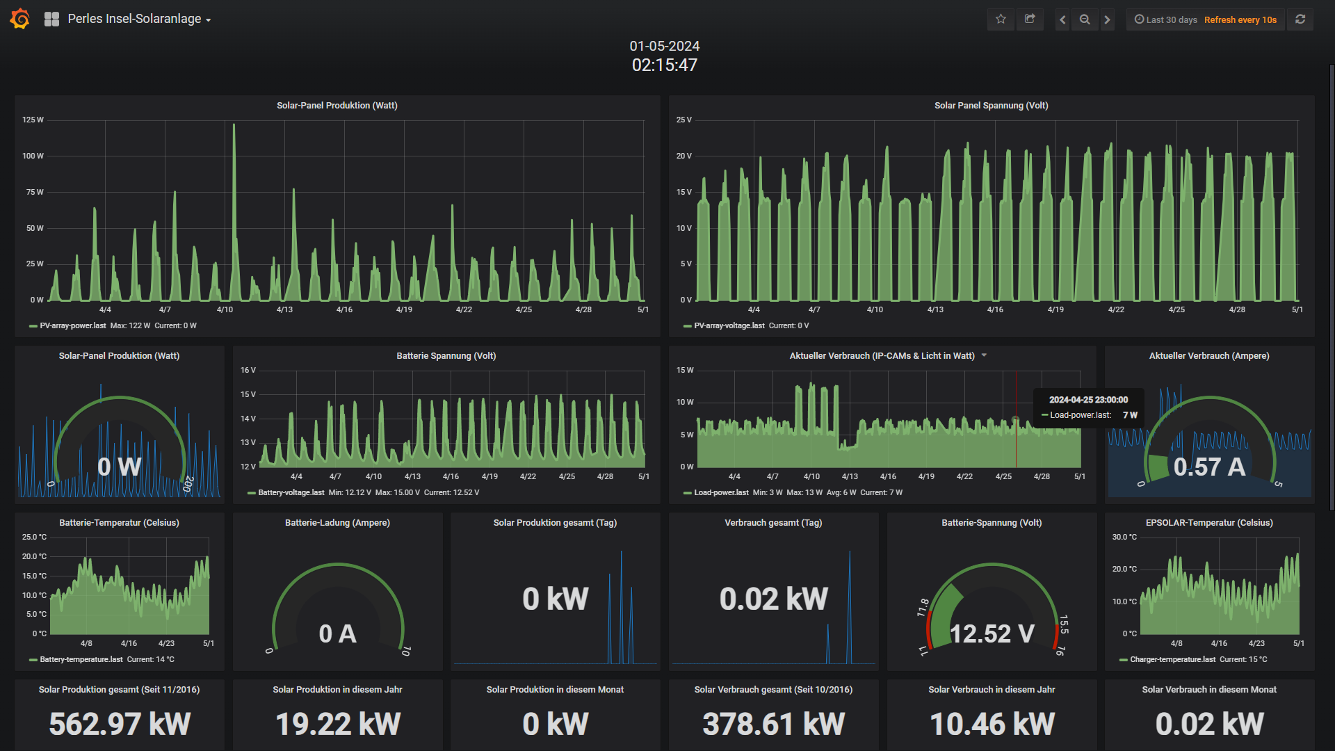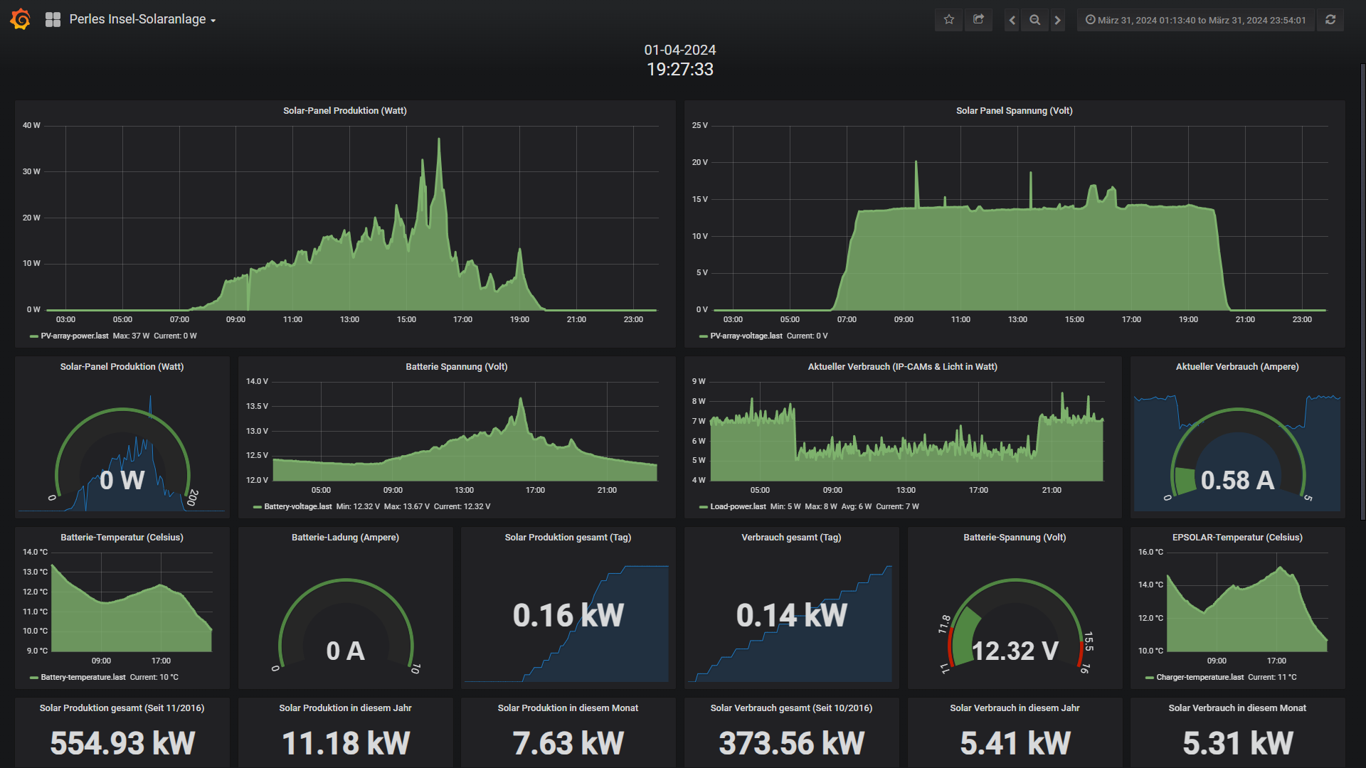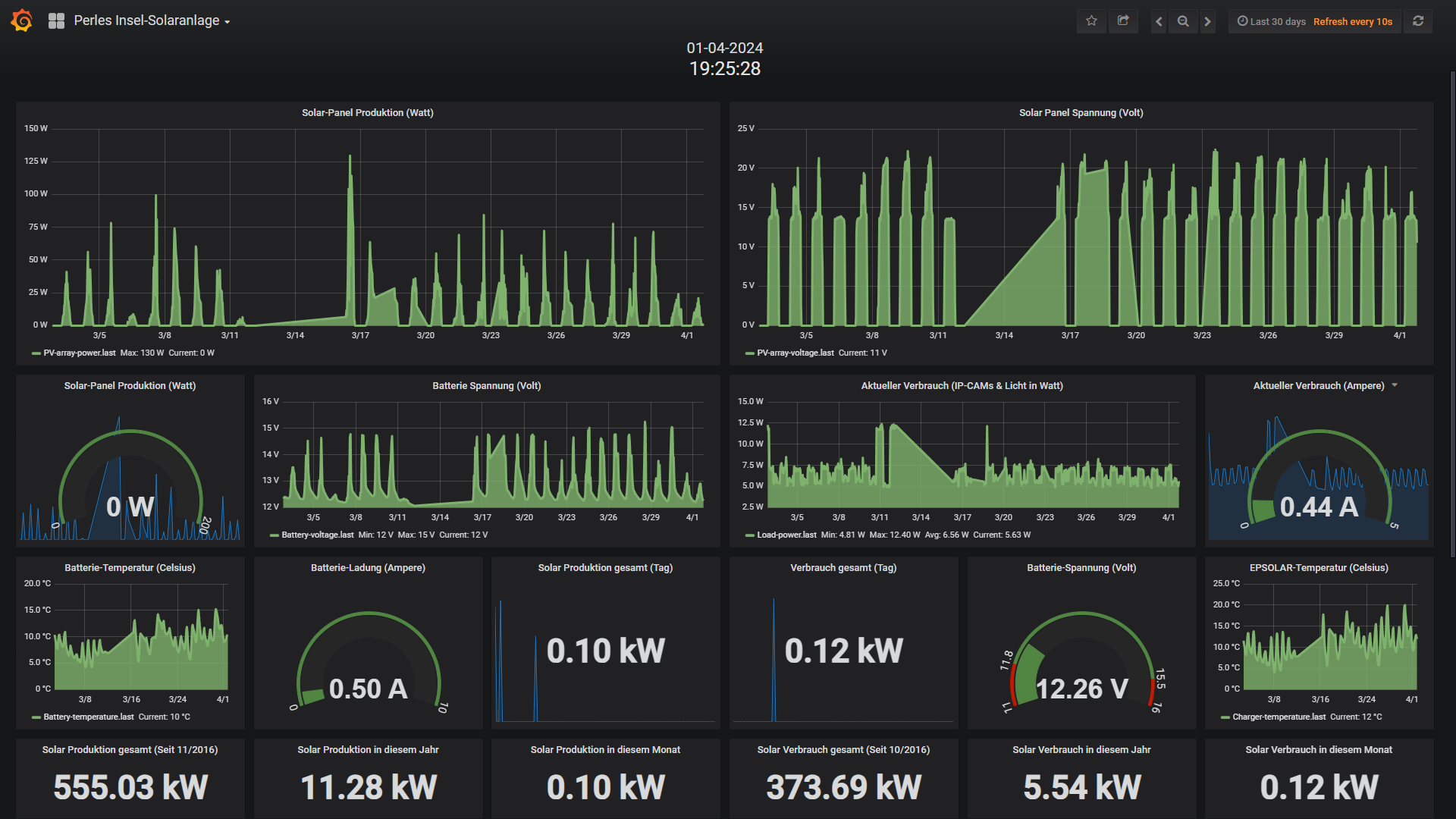 Die kleine 200 Watt Insel-Solaranlage: Da die Tage wieder länger werden hatte die kleine Insel-PV keine Probleme und lief wieder solide und Störungsfrei durch. Auch die Voll-Backups mit dem preiswerten Mesh-Repaeter laufen nun perfekt, sodass sich dieses kleine Update klar gelohnt hat. Die Insel versorgt die Verbraucher wieder mit Sonnenstrom und schaufelt Tagsüber die Nachts verbrauchten Strom in die beiden 100Ah Blei/Säure Akkus. Nur das IR-Flutlicht habe ich abgeschaltet gelassen, da dann der Verbrauch bei dem doch recht schlechten Wetter evt. doch zu hoch gewesen wäre. Hier kann man gut erkennen wie schlecht das Wetter in diesem April tatsächlich war. Siehe hier: