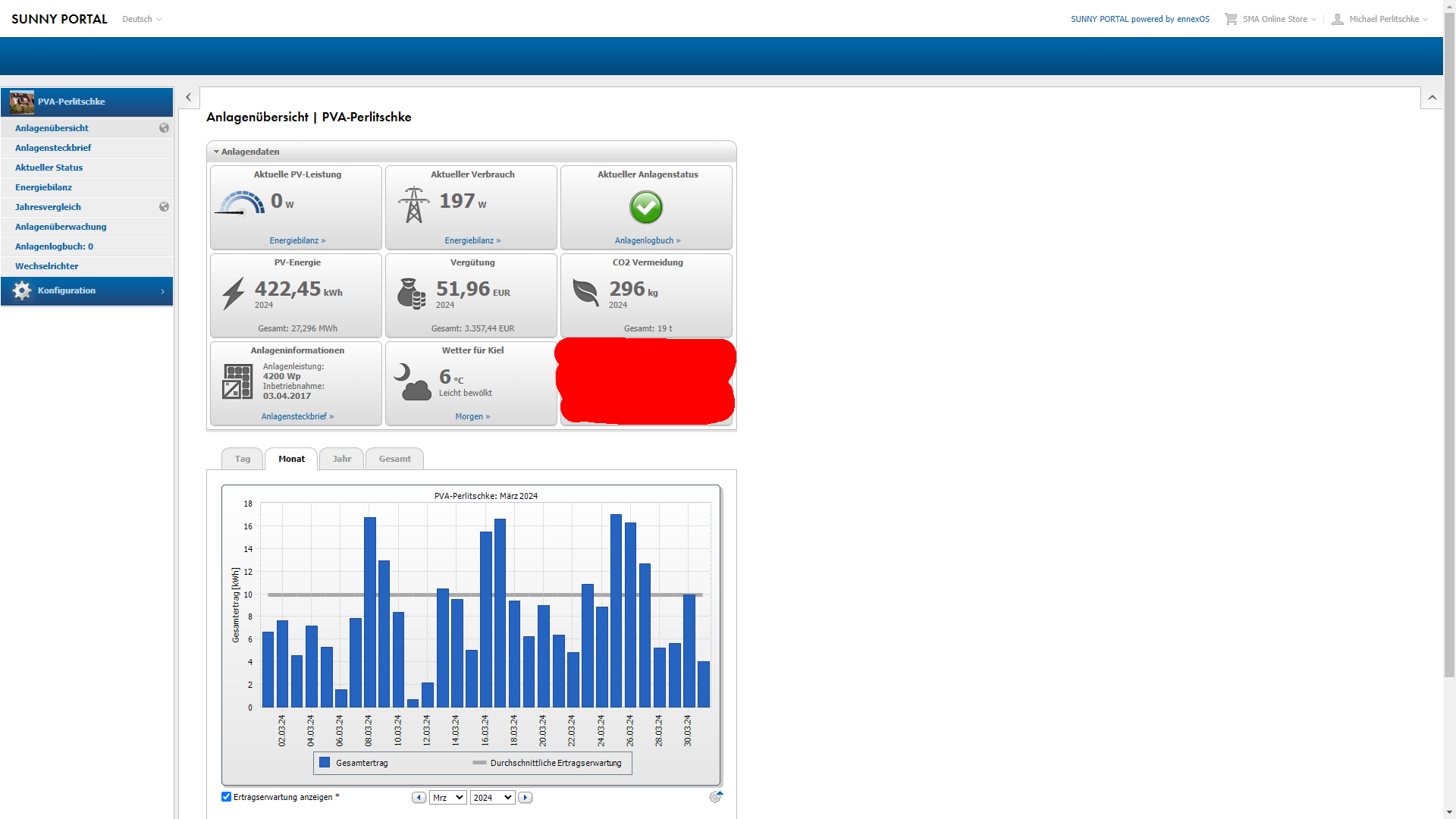 Hier die 4.2kwp Photovoltaik-Anlage auf dem Dach: Nun kommen wir zur kleinen 4,2kwp Dach PV Anlage und dem März-Ertrag. Wie schon oben im Wetter-Update für den März berichtet, war klar, dass dieser März kein neuen Rekord aufstellen wird. Eher im Gegenteil, der Oktober; November, Dezember 2023 und Januar 2024 erbrachten Negativ-Rekorde. Und im Februar 2024 sah es durchaus sehr ähnlich aus. Es kam nur so wenig Strom vom Dach, das ein giganischer Minus-Rekord zu verzeichnen ist. Die Ertragserwartung für den März lag bei 171,27kwh und vom Dach kamen lächerliche 92,5kwh. Das entspricht diesen Monat einem Minus von ca. 46% gegenüber der Ertragserwartung. Das ist ein denkwürdig guseliger Ertragswert! So schlecht, dass man an dieser Stelle kaum noch Lust hat weiter zu schreiben. Also am besten ganz schnell vergessen...