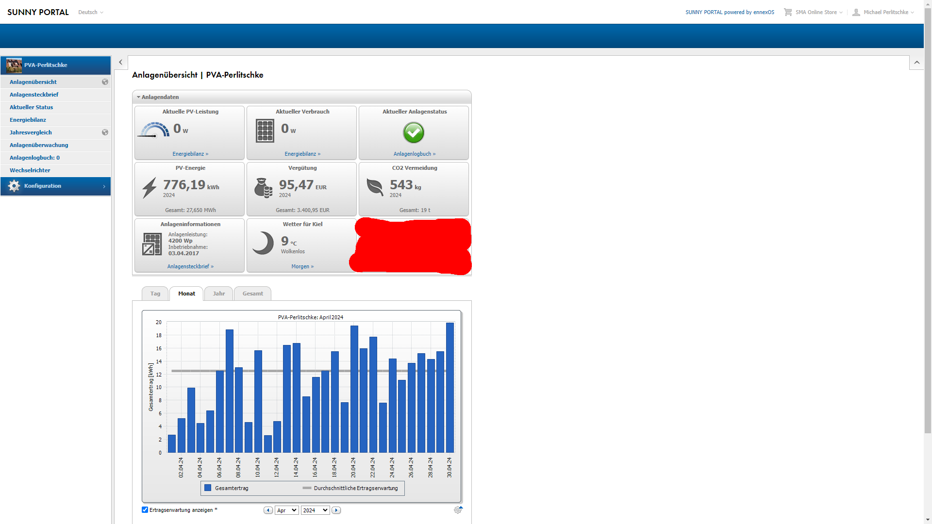 Hier die 4.2kwp Photovoltaik-Anlage auf dem Dach: Nun kommen wir zur kleinen 4,2kwp Dach PV Anlage und dem April-Ertrag. Wie schon oben im Wetter-Update für den April berichtet, war klar, dass dieser Monat kein neuen Rekord aufstellen wird. Eher im Gegenteil, der Oktober; November, Dezember 2023; Januar 2024; Feburar 2024 & März 2024 erbrachten Negativ-Rekorde. Und diesen April 2024 sah es durchaus sehr ähnlich aus. Es kam in der ersten Monatshälfte nur so wenig Strom vom Dach, das es so aussah das auch dieser Monat mit einem giganischer Minus-Rekord beendet wird. Zum Glück besserte sich das Wetter gegen Ende April, sodass dann doch noch etwas Strom zusammen kam. Die Ertragserwartung für den April lag bei 375,71kwh und vom Dach kamen mit viel Glück doch noch 353,75kwh. Ein weiterer neuer Minus-Rekord, denn das war seit bestehen der Anlage der schlechteste April. Das entspricht diesen Monat einem Minus von ca. 6% gegenüber der Ertragserwartung. Nun könnte man schreiben, 6% Minus geht doch, Perle! Nee....geht nicht, denn der April war in den letzten 7 Jahren immer ein Monat wo die Anlage richtig fett Plus erwirtschaftet hat. Hier sieht man deutlich wie grottig schlecht diesen Monat das Wetter war.