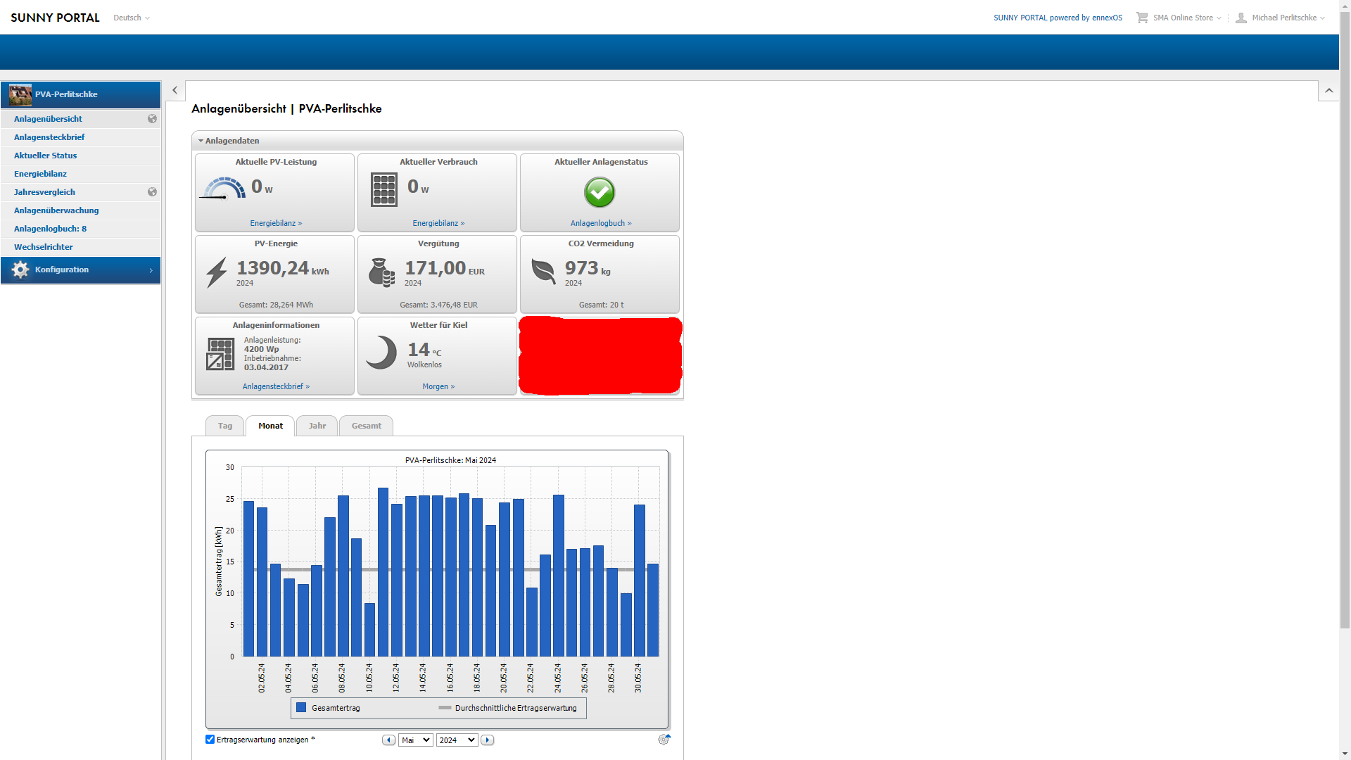 Hier die 4.2kwp Photovoltaik-Anlage auf dem Dach: Nun kommen wir zur kleinen 4,2kwp Dach PV Anlage und dem Mai-Ertrag. Oben im Wetter-Update war ich schon am schwärmen und das Ergebnis dieses schönen Mai Monats ist dann auch das 2beste Ergebnis seit dem die PV-Anlage läuft. Respekt! Die Ertragserwartung für den Mai lag bei 425,32kwh und vom Dach kamen satte 614,05kwh. Bei Olympia wäre das Silber, denn das war seit bestehen der Anlage der zweitbeste Mai. Das entspricht diesen Monat einem Plus von satten 44,37% gegenüber der Ertragserwartung. WOW! Endlich mal wieder ein echtes Highlight nach den letzten 6 Gruselmonaten. Wirklich ganz toll, denn auch im Mai gab es Phasen mit Regen und 7 Tage durchwachsenes Wetter. Es waäre noch deutlich mehr möglich gewesen, aber auch dieses Ergebnis zaubert einem ein Lächeln ins Gesicht.