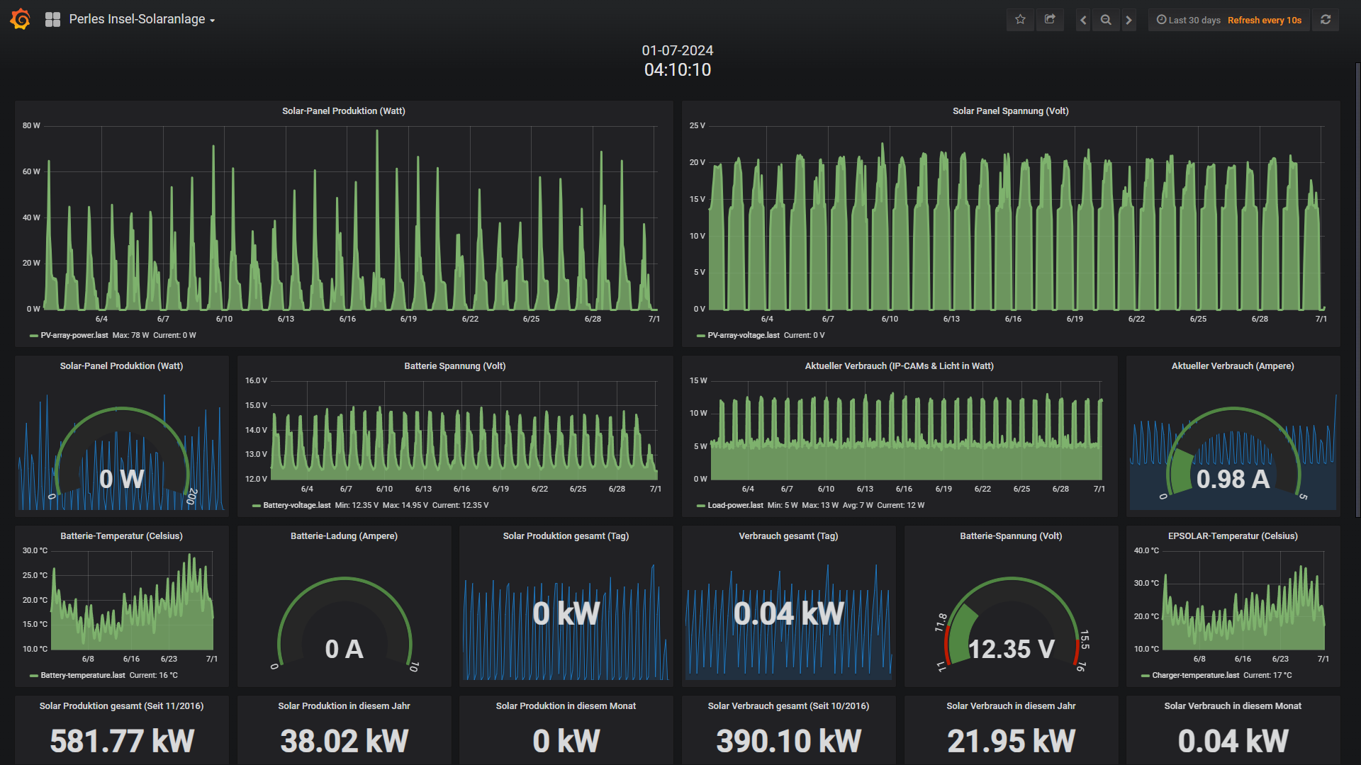 2,7kwh LiFePo4 DIY Speicher und Dynamische Akku Ladung und Nachteinspeisung: Die dynamische Nachteinspeisung lief natürlich den kompletten Monat und zeigte erneut keinerlei Auffälligkeiten. Meine programmierte Node-RED Steuerung lief weiterhin Fehlerfrei und grundsolide. So solide das ich in der 3ten Juliwoche in der ich im Ruhrpott auf einem BR-Seminar war, die Anlage AUTARK laufen liess. Wo ich im Juni noch bedenken hatte die Anlage ohne aufsicht laufen zu lassen, verdichtet sich langsam die Gewissheit das alles PERFEKT läuft und ich in meiner Node-RED Steuerung nichts mehr übersehen habe. Da darf ich mir wohl auf die Schulter klopfen, denn meine Hartnäckigkeit in der Perle-Programmierung und Steuerung trägt Früchte. Meine Zuversicht bezüglich aller Funktionen ist mittlerweile so gross das wenn ich heute 3-4 Wochen in Urlaub fahren würde, die Anlage einfach weiter laufen lassen würde (im Juni hatte ich da noch leichte Bedenken).