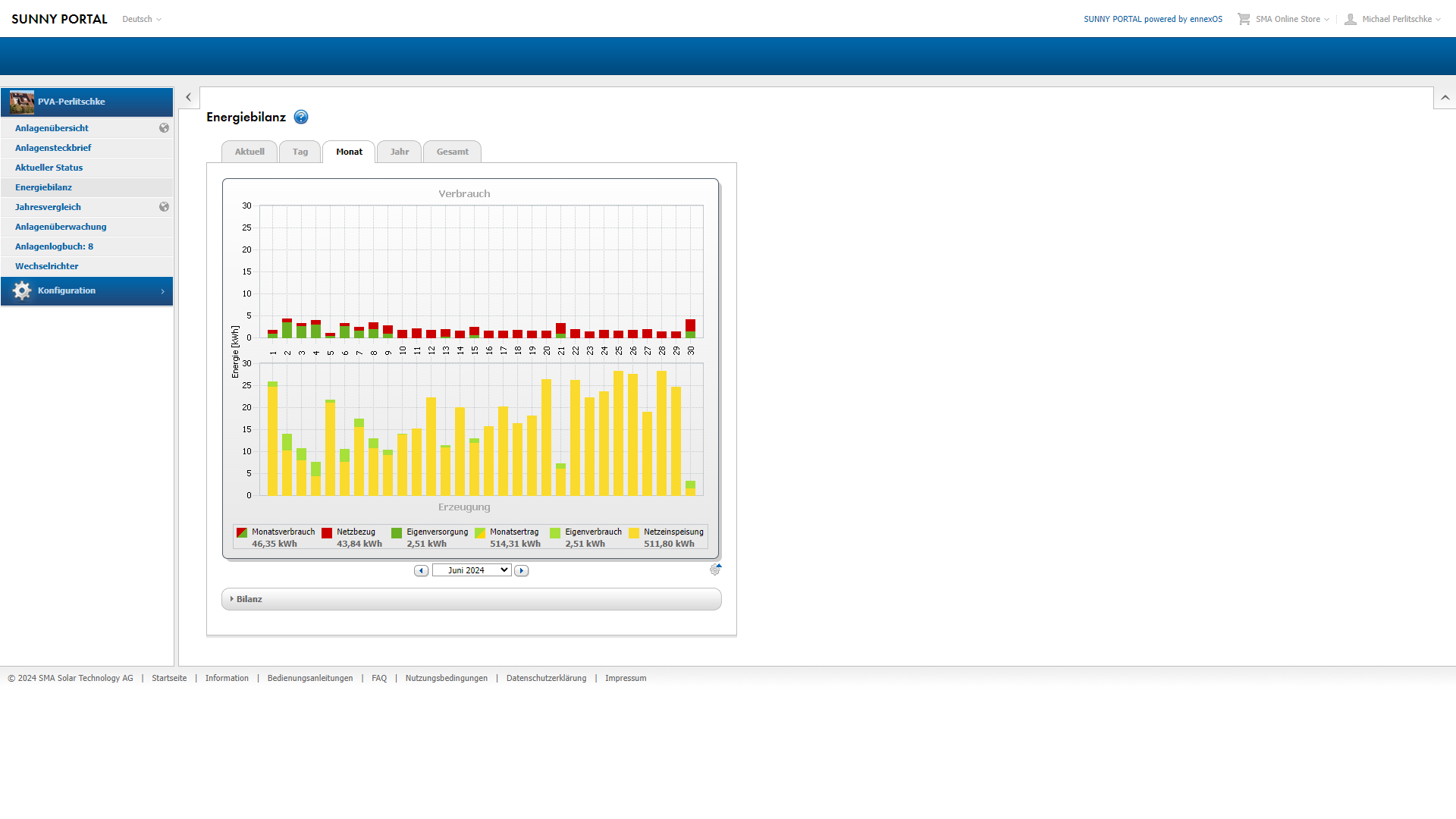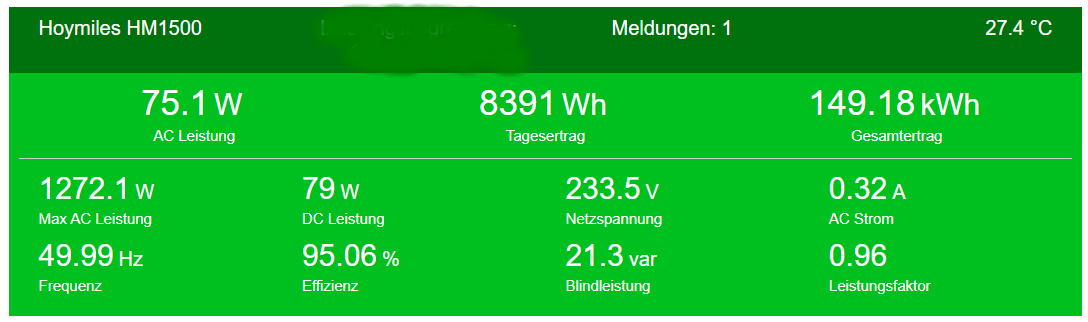 Und natürlich alles korrekt am 12 Mai im Martstammdatenregister registriert und meinem Netzbetreiber Fotos von den Zählerständen zukommen lassen. Denn was passiert. Zu meiner 4200 Watt PV EEG Anlage kommt nun auch mein Balkonkraftwerk auch als EEG Anlage. Der Netzbetreiber trennt das mathematisch. Alles was ausgespeist wird ,wird weiterhin mit 87,5% mit 12,3 Cents bezahlt und 12,5% werden mit 8,2 Cents vergütet. Alles ganz unkompliziert, wobei ich bis heute noch keinen neuen Vertrag erhalten habe. Also rechne ich erstmal weiter mit vollen 12,3 und 100%. Das spannende an der flach liegenden Carport-Anlage ist aber folgendes. Schon morgens kurz nach Sonnenaufgang produzieren die beiden Module Strom satt ( da liegt meine grosse Anlage noch in Sauer). Somit sackt nun auch Tagsueber insbesondere Vormittags der Bezug da dieser durch das Carport gedeckelt wird. Schon 10 Uhr produzieren beide Anlagen soviel ÜberschussEnergie das diese zum Laden des Nachtspeichers reicht. Gegen 14 Uhr ist dieser Voll (wird faktisch komplett vom Carport mit Strom beliefert) und der Hausverbrauch wird komplett vom Carport geddeckt und da kommt so dermassen viel das auch noch ein Teil Ausgespeisst wird. Die grosse PV-Anlage kommt eigentlich nur noch ins Spiel wenn Waesche gewaschen; gekocht wird oder andere Stromhunrige Sachen ablaufen (E-Auto laden). Das ganze läuft besser als ich selbst unter positivsten Annahmen erwartet hättet. Das war eine ganz vorzügliche Idee und in den 3 Wochen in denen das Carpport-Kraftwerk lief fischte es satte 110,53kwh vom Carport. Diese wurden auch zu 95% selbst verbraucht, sodass 40,81 Euro (95%) dabei rum kamen. D.h. es sind in 3 Wochen 8,36% Prozent der gesamten Investition (488 Euro) vom Carport geflossen. Die gesamte Installation wird wohl schon im Herbst naechsten Jahres die 488 Euro knacken und sich selbst komplett bezahlt haben. Und das obwohl die Platten Flach auf dem Carport liegen. Vorteil ist von morgens bis Abends liefern die dafuer Konstant, also bis zu 5,3kwh pro Tag! Wenn der Tag nicht so schön ist, kleckern immer noch >2kwh von den Platten ins Haus. Man bedenke, 95% davon verbrauche ich selbst, sodass das dieses Eigenverbrauch ist. Das SMA-System sieht nur das das Haus keinen Strom benötigt also sehr oft bei 0 Watt Verbrauch liegt (klar, weil das Carport alles wegbuegelt) und ballert alles was vom Dach kommt aus dem Haus ins Netz. Entsprechend riesig ist dadurch auch die Netzeinspeisung. Ganz grosses Kino!