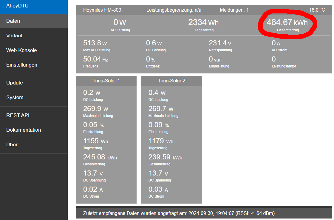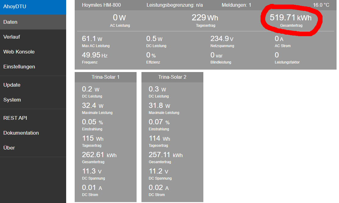Solaranlage: Inbetriebnahme 16.10.2016; 17 Uhr; Tag 0