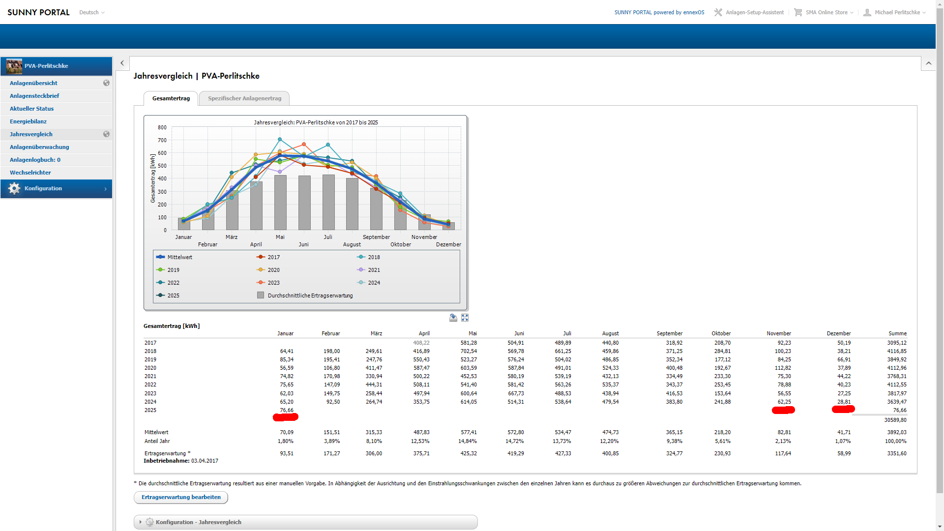Hier die 4.2kwp Photovoltaik-Anlage auf dem Dach: Nun kommen wir zur kleinen 4,2kwp Dach PV Anlage und dem November; Dezember & Januar-Erträgen. Die Ertragserwartung für den November lag bei 117,64kwh und vom Dach kamen lächerliche 62,25kwh. Die Ertragserwartung für den Dezember lag bei 58,99kwh und vom Dach kamen nur 28,81kwh. Die Ertragserwartung für den Januar lag bei 93,51kwh und vom Dach kamen immerhin 76,66kwh (das ist der zweitbeste Wert seit Inbetriebnahme 2017). Alles in allem NOVEMBER & DEZEMBER ein Solarer Totalschaden (siehe oben bei der Wetterbeschreibung) und der JANUAR war so gesehen zwar auch unter der Erwartung, aber letztlich reihte es für die Silbermedaille. Erstaunlich! Schaut Euch das unten (habe ich rot markiert einfach mal an):