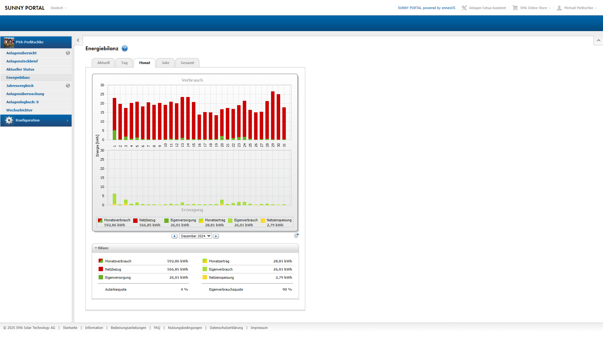 Im Dezember 2024 kamen in Summe 28,81kwh vom Dach. Der Stromzukauf von Octopus Energy lag für diesen Monat bei 566,85kwh (inkl. täglicher Warmwasseraufbereitung & Heizen mittels Wärmepumpe), welche bei 29,02 Cents pro Kilowattstunde meines Ökostrom-Tarifes ca. 164,50 Euro Strom Einkaufskosten bedeutet. Von den produzierten 28,81kwh habe ich 26,01kwh selbst verbraucht, was eine Ersparnis bei einem Kilowattstundenpreis von 29,02 Cents in Summe 7,55 Euro ergibt. Den Rest, also 2,79kwh an Strom wurden für 0,123 Cents ins Netz abverkauft, was letztendlich 0,34 Euro an Einnahmen durch den Stromverkauf bedeutet.