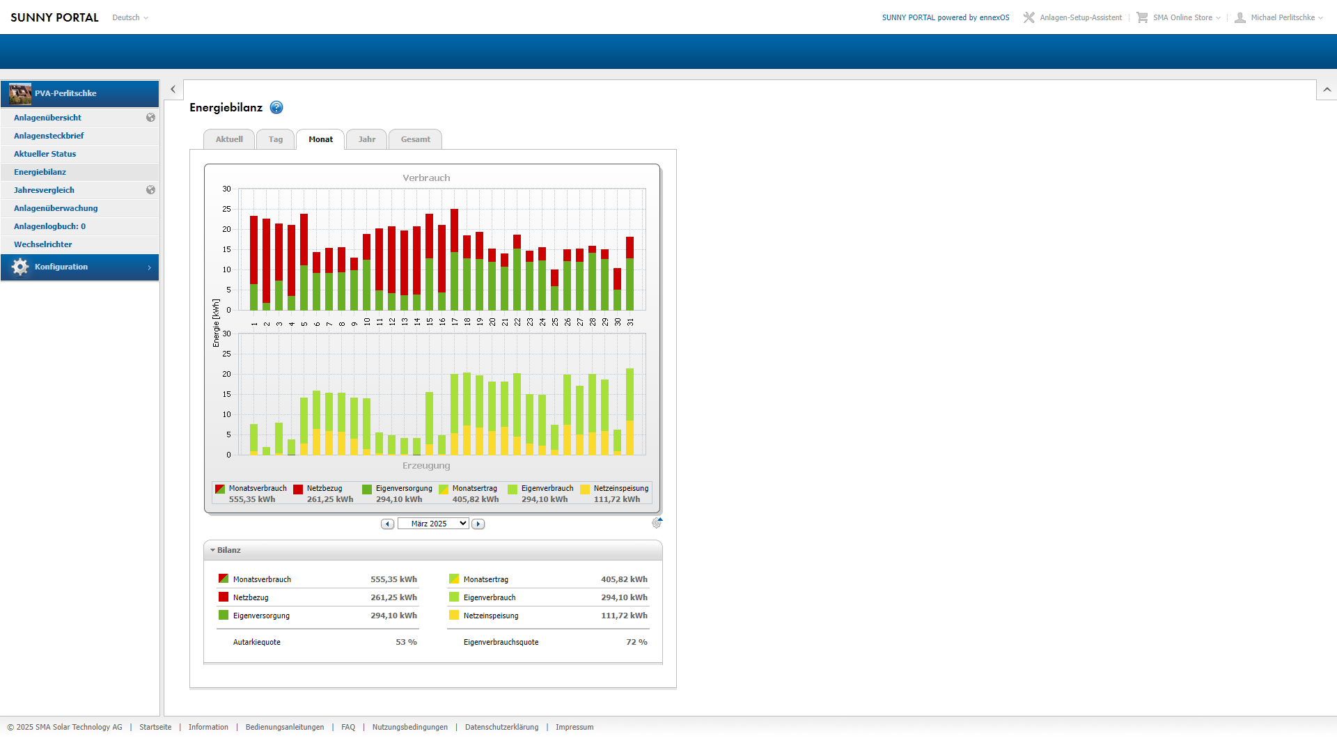 Hier die 4.2kwp Photovoltaik-Anlage auf dem Dach: Nun kommen wir zur kleinen 4,2kwp Dach PV Anlage und dem März-Ertrag. Die Ertragserwartung für den März lag bei 306kwh und vom Dach kamen 405,82kwh. Also ein deutliches Ertragsplus aufgrund des schönen Wetters ab der 2ten Monatshälfte. Das ist das Drittbeste Monatsergebnis für einen März seit Inbetriebnahme der PV-Anlage. Das entspricht für diesen Monat ein Plus von 32,6% gegenüber der Ertragserwartung. Ein sehr zufriedenstellendes Monats-Ergebnis!