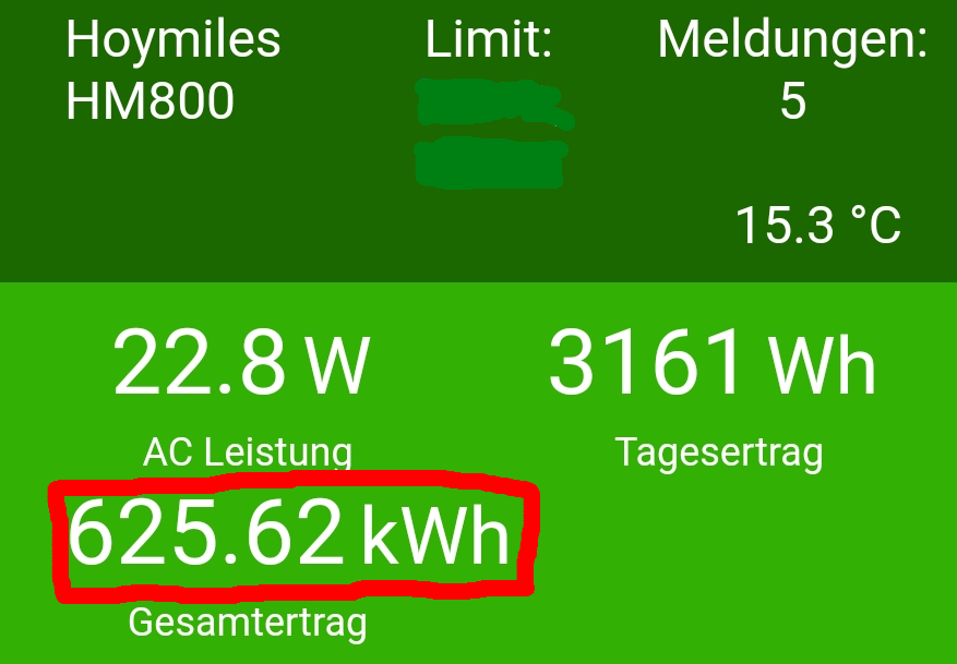 Summe nach dem nun 5 Produktions-Monaten im 8 Produktionsjahr: 625,03 Euro