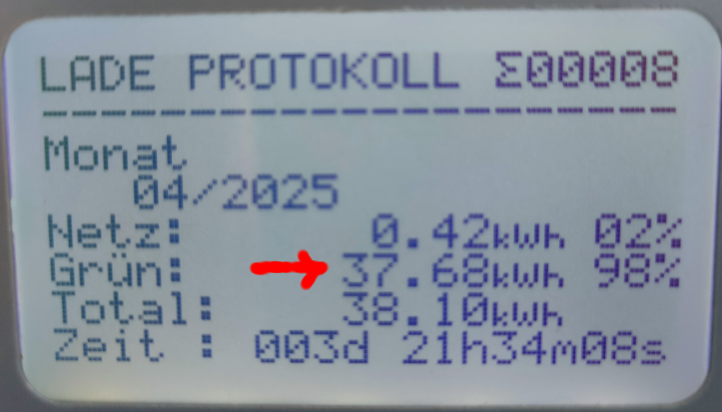 Nun aber zum April 2025 und Carport-Anlage; Nachteinspeisungen also das Ergebnis des ersten Monats im 9ten Betriebsjahr. Vom Dach kamen in diesem April 2025 in Summe 517,84kwh. Der Stromzukauf von Octopus Energy lag für diesen Monat bei 75,37kwh (inkl. täglicher Warmwasseraufbereitung & 3/4 des Monats Heizen mittels Wärmepumpe), welche bei 29,02 Cents pro Kilowattstunde meines Ökostrom-Tarifes ca. 21,87 Euro Strom Einkaufskosten bedeutet. Von den produzierten 517,84kwh habe ich 211,12kwh + 61,86kwh von der Carport PV selbst verbraucht, was eine Ersparnis bei einem Kilowattstundenpreis von 29,02 Cents in Summe 79,21 Euro ergibt. Den Rest, also 332,3kwh an Strom (PV und Carport) wurden für 0,123 Cents ins Netz abverkauft. Davon 87,5% also 290,76kwh zu 0,123 Cents und 41,54kwh zu 8,1 Cents was in Summe 35,76 Euro + 3,36 Euro = 39,12 Euro an Einnahmen durch den Stromverkauf bedeutet.