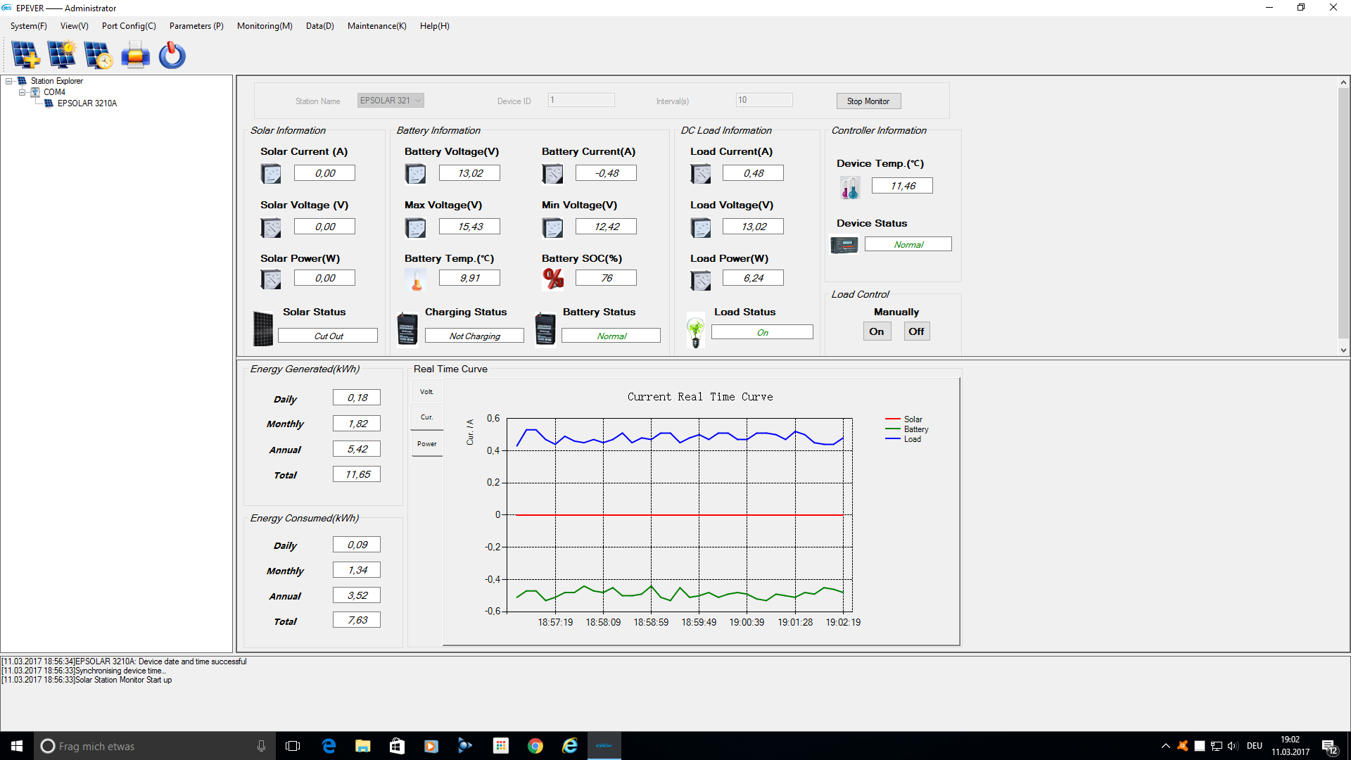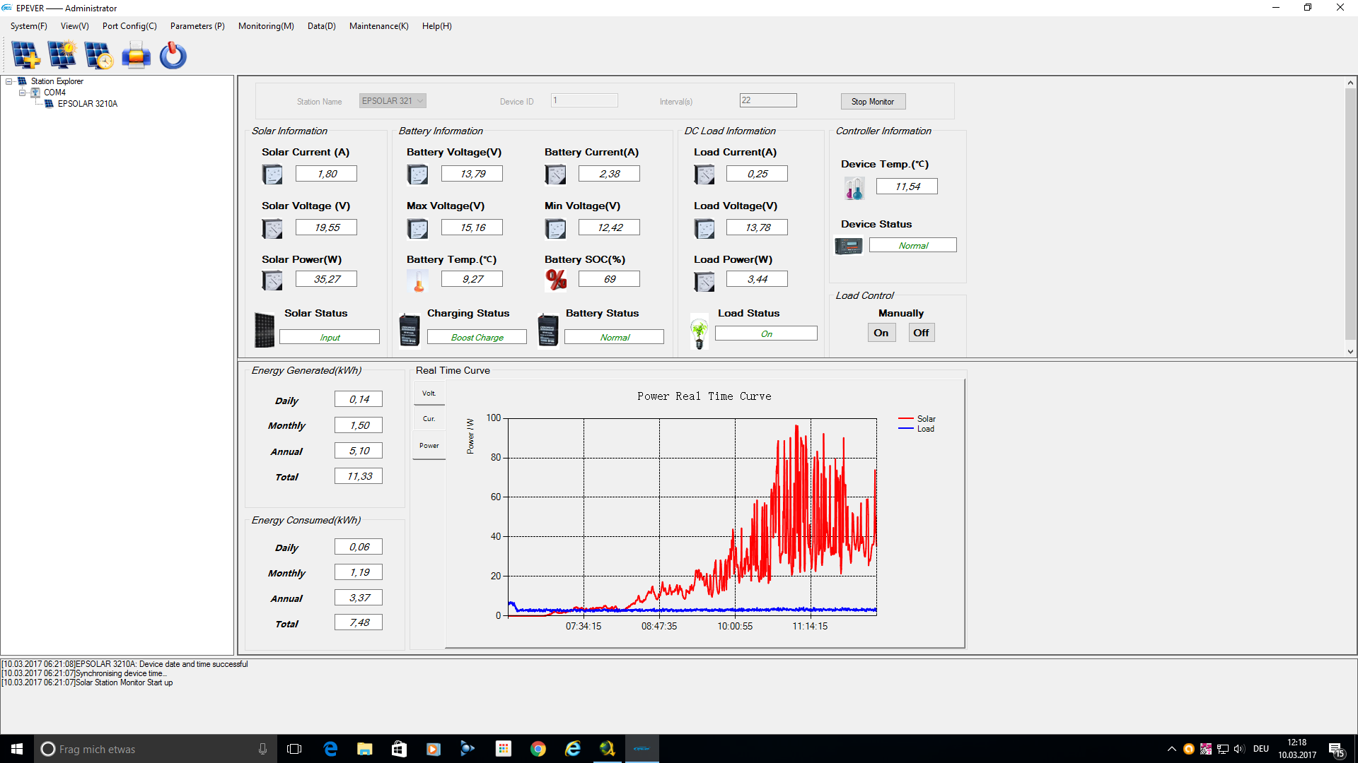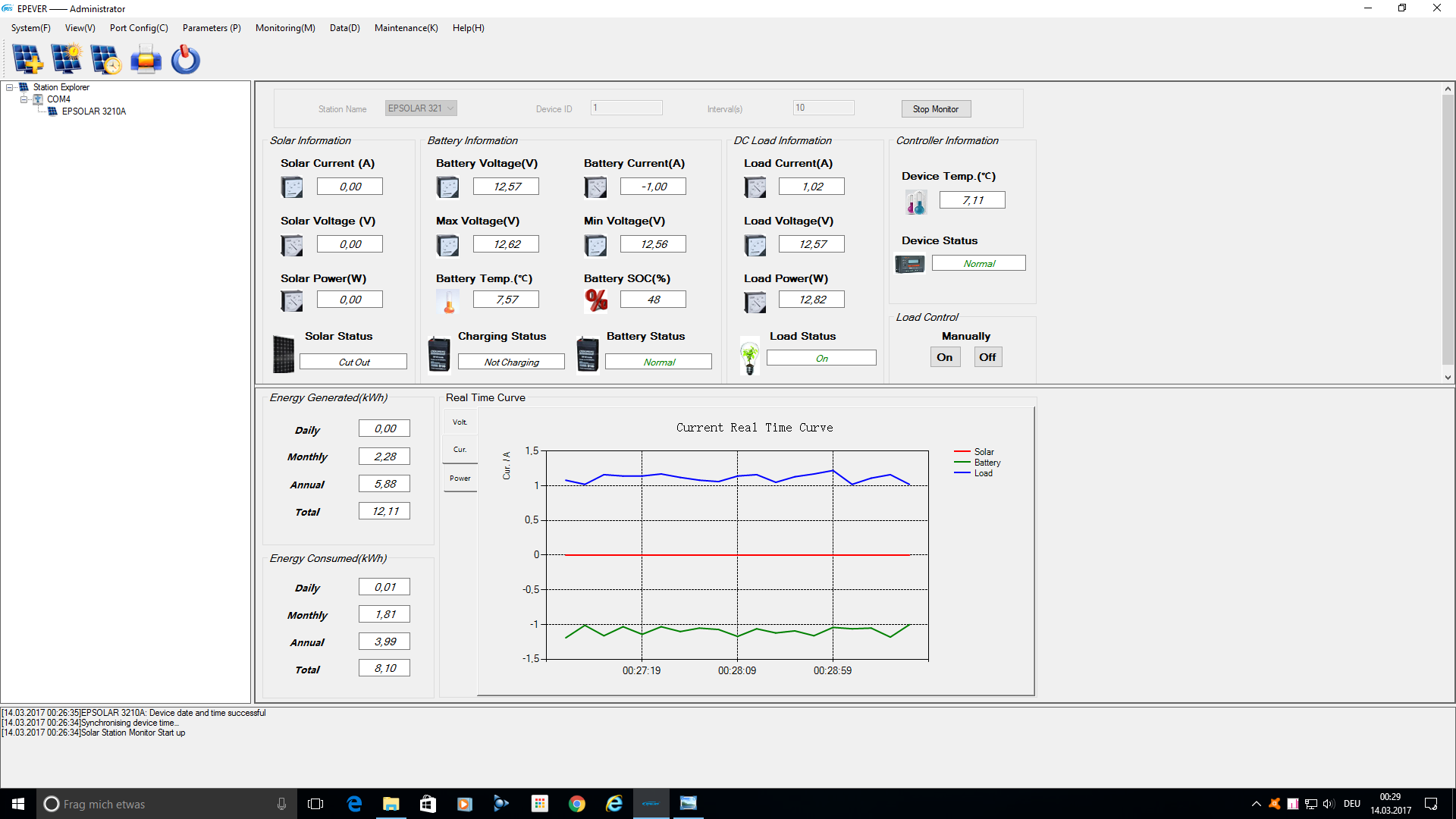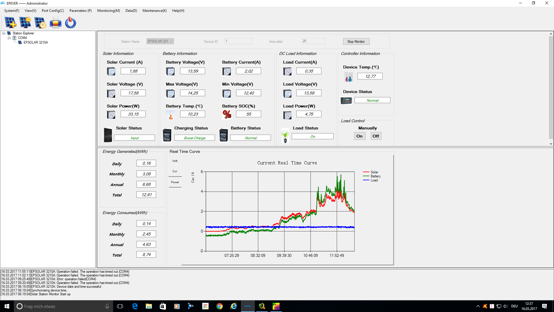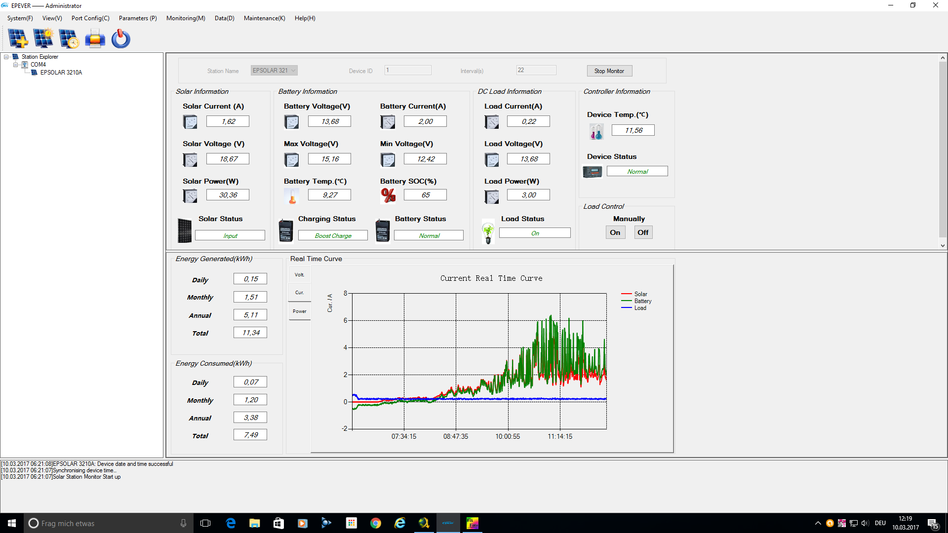 Die kommenden 3 Tage werden also spannend und koennte zeigen zu was diese kleine Anlage schon mitte Maerz imstande waere. Allein vor diesem Hintergrund ein super Test...uebrigens, bei unterschreiten von 12,00 Volt Akku-Spannung kappt der EPSOLAR die LAST (das habe ich extrem hoch auf Sicherheit gestellt, da ich den Akku unter keinen Umstaenden zu sehr foltern moechte und 50% Entnahme meine Grenze darstellt). Morgen wird der jedenfalls das erste mal an die Substanz gehen und ich werde ganz spaet Nachts bereichten...