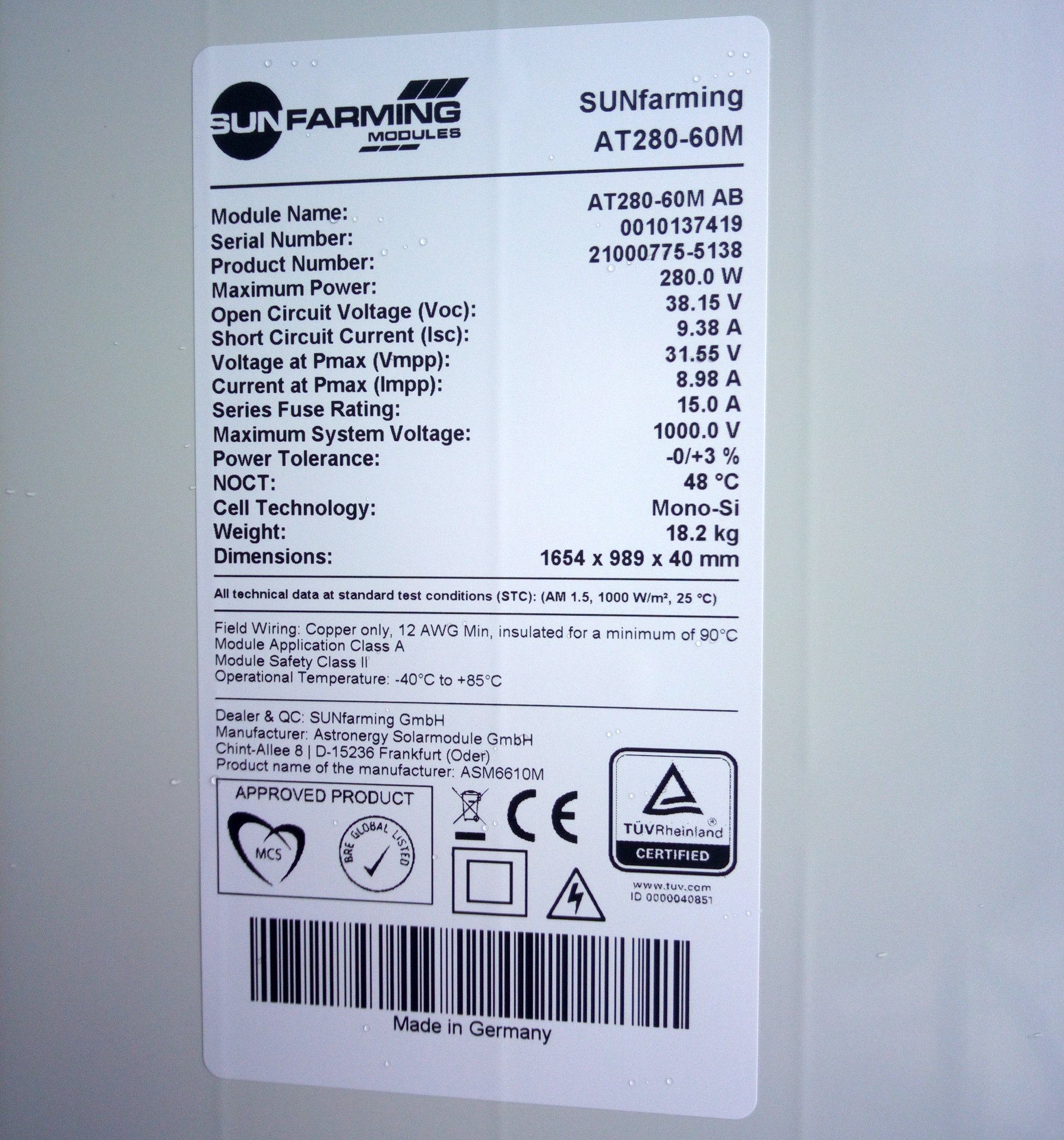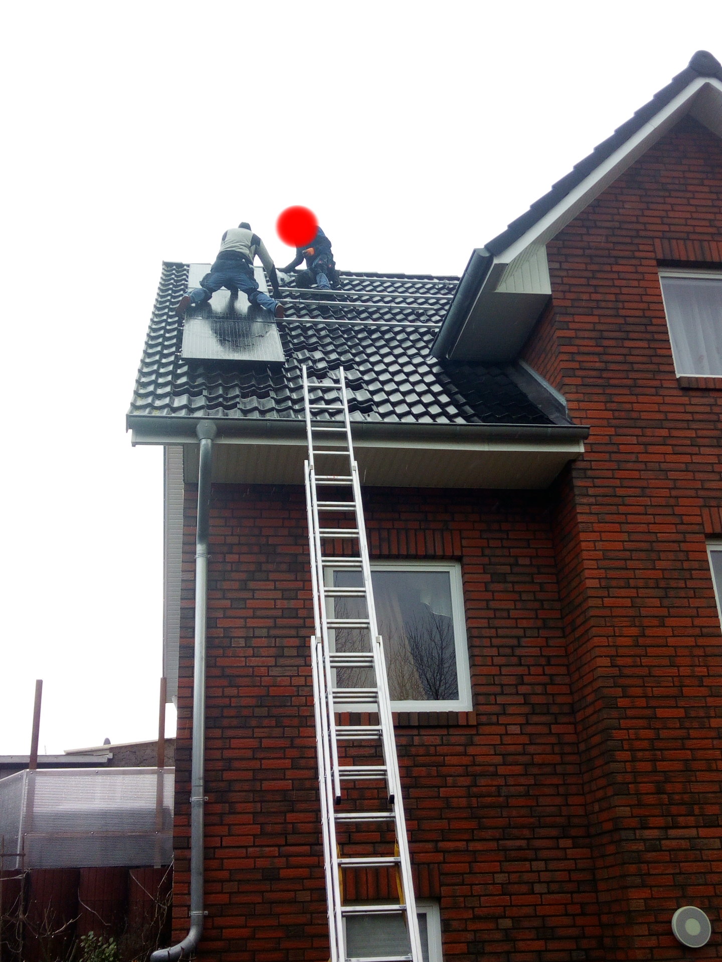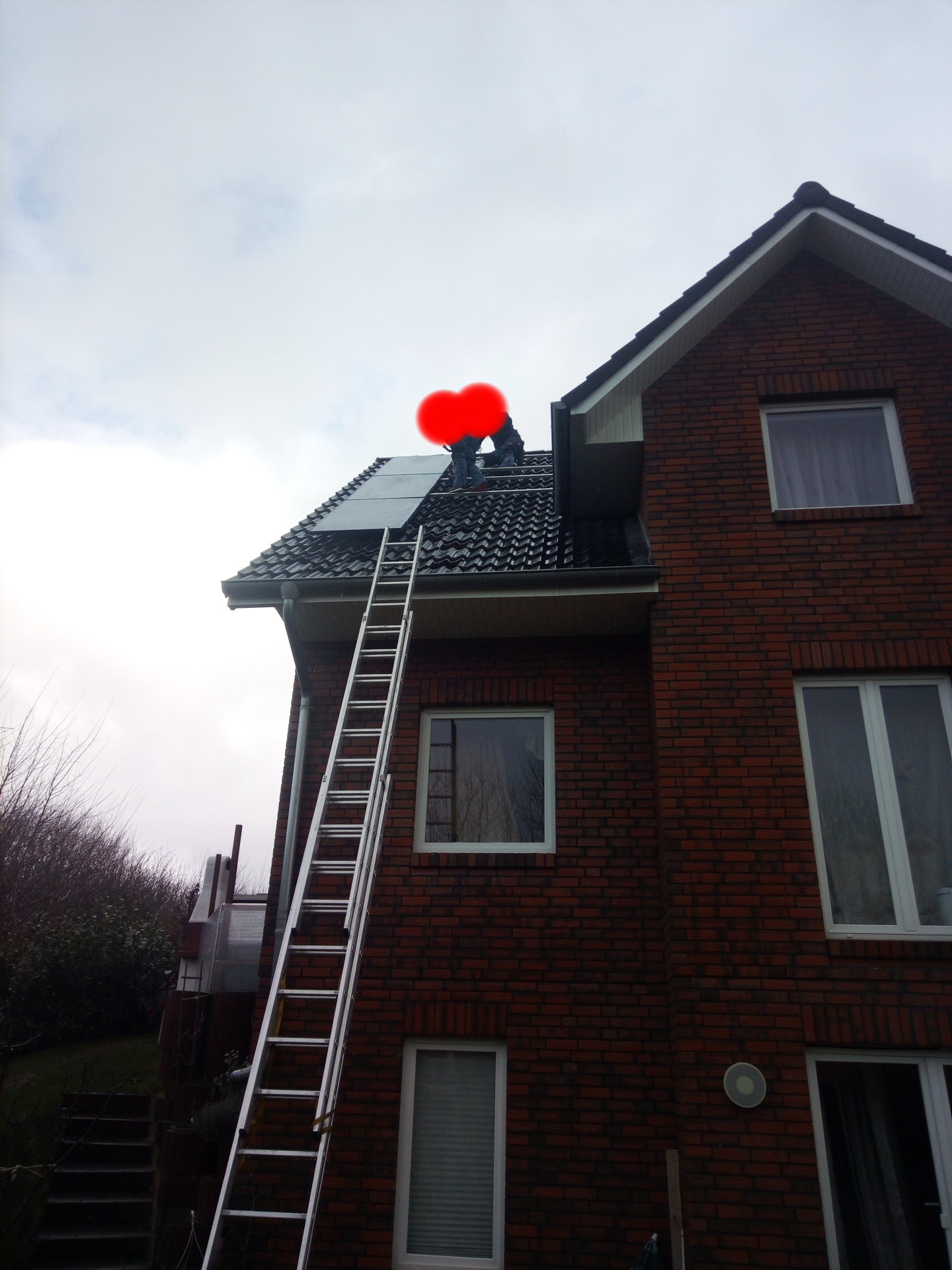 Heute bekam ich auch meine bestellten SUNfarming 280WAtt Panel (Modell: AT280-60M) samt Montage zu sehen. Die Fachfirma welche dieses System in luftiger Hoehe ( diese Monster wurden bei Wind (fast schon Orkan) auf einer 9 Meter Leiter von einer Person auf Dach geschleppt ) installiert scheint ein Kooperations-Partner meines Kieler Solateures zu sein, denn die kommen aus Rostock angerueckt und denen sind selbst Orkanartige Boehen und heftiger Regen bei 10 Grad vollkommen egal. Die Jungs sind scheinbar aus KRUPP-Stahl und zaeh wie Rindsleder...