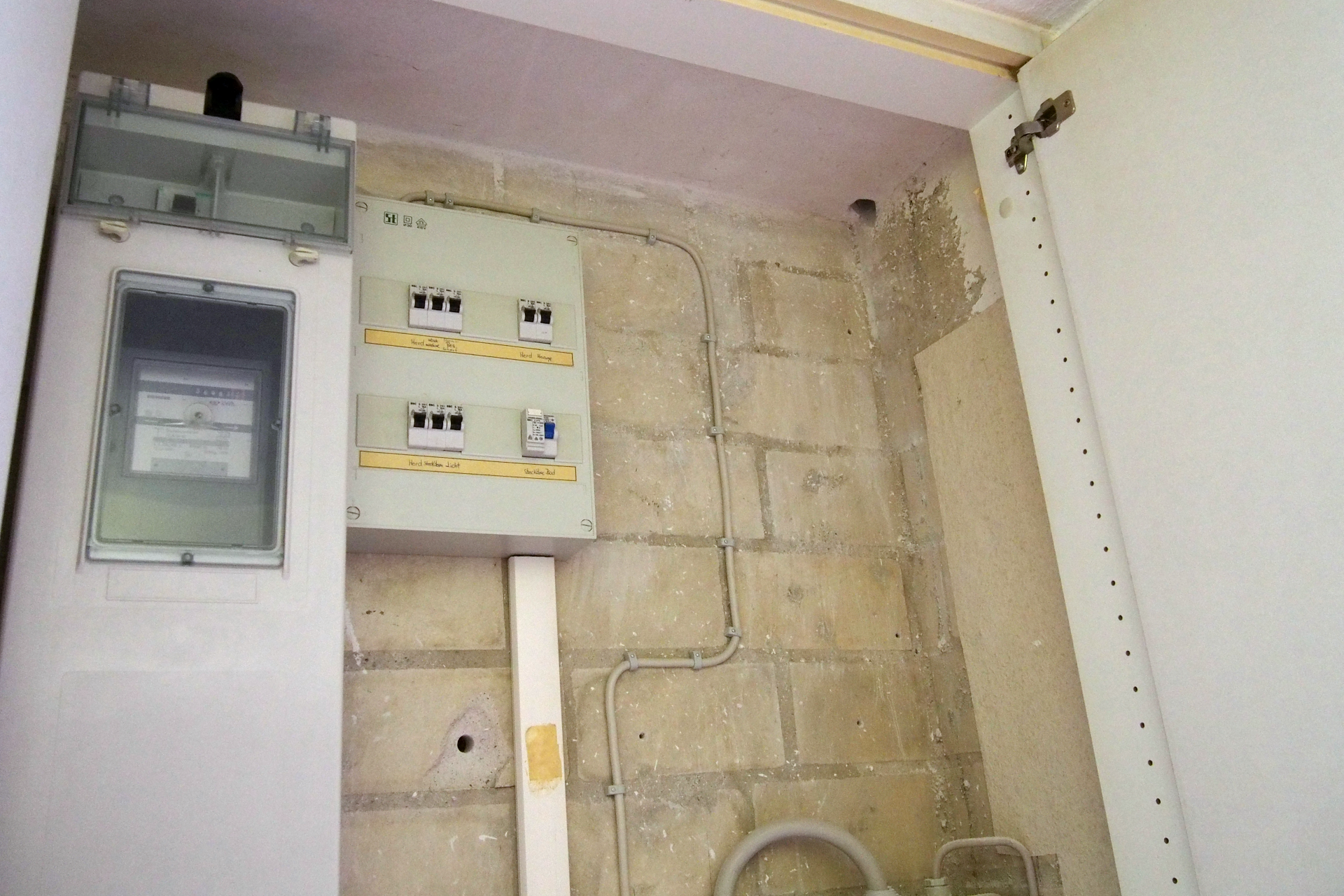 Heute kam der Elektro-Meister mit einem Gesellen und es wurde besprochen was in meinem Schaltschrank mit den Zaehlern und Sicherungen passieren wird. Das fliegt alles komplett raus und einiges muss umverlegt werden. Man baut mir nun einen 105-55cm grossen Schaltschrank ein und verlängert alle vorhandenen Elektroleitungen. Das ganze geht morgen den ganzen Tag (alles wird zerlegt und vorbereitet (und wieder grob verkabelt das ich Nachts Strom habe) und uebermorgen ist dann den ganzen Tag der Strom weg und die finale Schaltschrank-Montage findet statt. Eingeruestet wird auch das SMA-Energy-Meter welches mittels Ethernet-Kabel mit dem Wechselrichter kommuniziert und die dynamische 70% Regelung realisiert. Der Elektriker meinte das der brandneue Sonny Boy 4.0 ein ganz feines Stueck Technik darstellt und ich auch damit alles richtig gemacht habe.