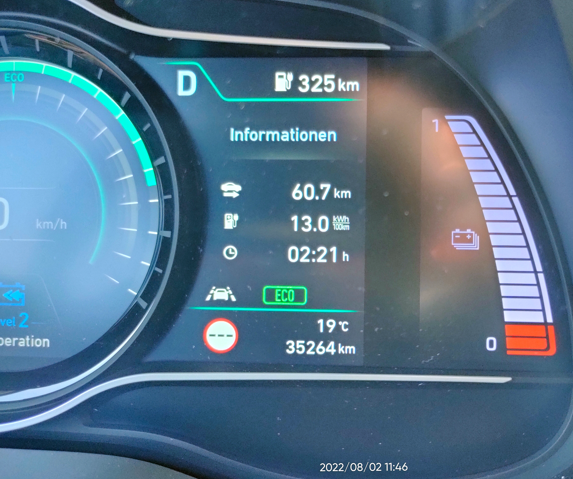 Der neue Akku wurde am 20.Januar 2022 hergestellt und mein Kona hat diesen am 2 August das allererste mal benutzt. Zwischen Abgabe und Ruecknahme sind 6km zusaetzlich auf die Tacho-Uhr gekommen. Ich nehme an, dass Hyundai Kiel nach dem Einbau dieser Distanzscheibe wie üblich eine kleine Probefahrt gemacht hat um den Erfolg der Aktion zu pruefen. Desweiteren wird der Wagen durch das Ver/Entladen und den Akkutausch sicherlich auch ein paar 100 Meter bewegt worden sein. Uebernommen habe ich meinen Kona mit neuen Akku mit 97% Kapazitaet. Und nun kann ich nach 1 Jahr mit max. 90% SOC nun bei Bedarf auch wieder bis 100% laden, denn der neue Akku ist natuerlich Tip-Top in Ordung.