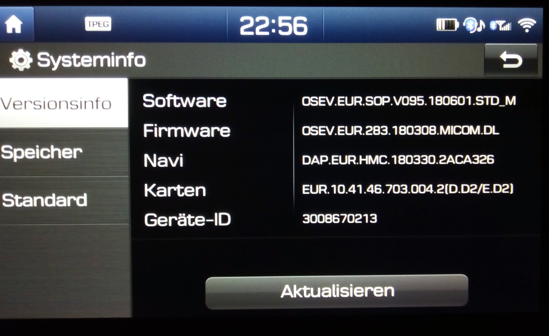 Meine Software-Version befindet sich derzeit auf dem Stand 01.06.2018 und die Firmware-Version auf dem Stand 08.03.2018 (man liesst das Datum im Info-Screen immer Rueckwaerts). Der Datenstand des Navis befindet sich auf dem Stand vom 30.03.2018...