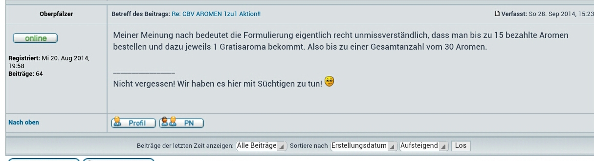 Also wer lesen kann ist klar im Vorteil. Obiges heisst: Man kann sich 15 Aromen a 10 oder 20ml oder gemixt zum normalen Kurs dort in den Warenkorb legen. Beim CheckOut traegt man dann in das Textfenster fuer die persoenlichen Hinweis an CBV die 15 Aromen ( so man zuvor 15 im Korb liegen hat ) welche einem CBV kostenlos beilegen soll. Sollte man also 5 Stueck a 20ml im Korb liegen haben und 10 Stueckl a 10ml, schreibt man in das Textfenster die 5 Stueck a 20ml Aromen rein welche kostenlos beileget werden sollen und die 10 Aromen a 10ml welche CBV kostenlos beilegen soll.