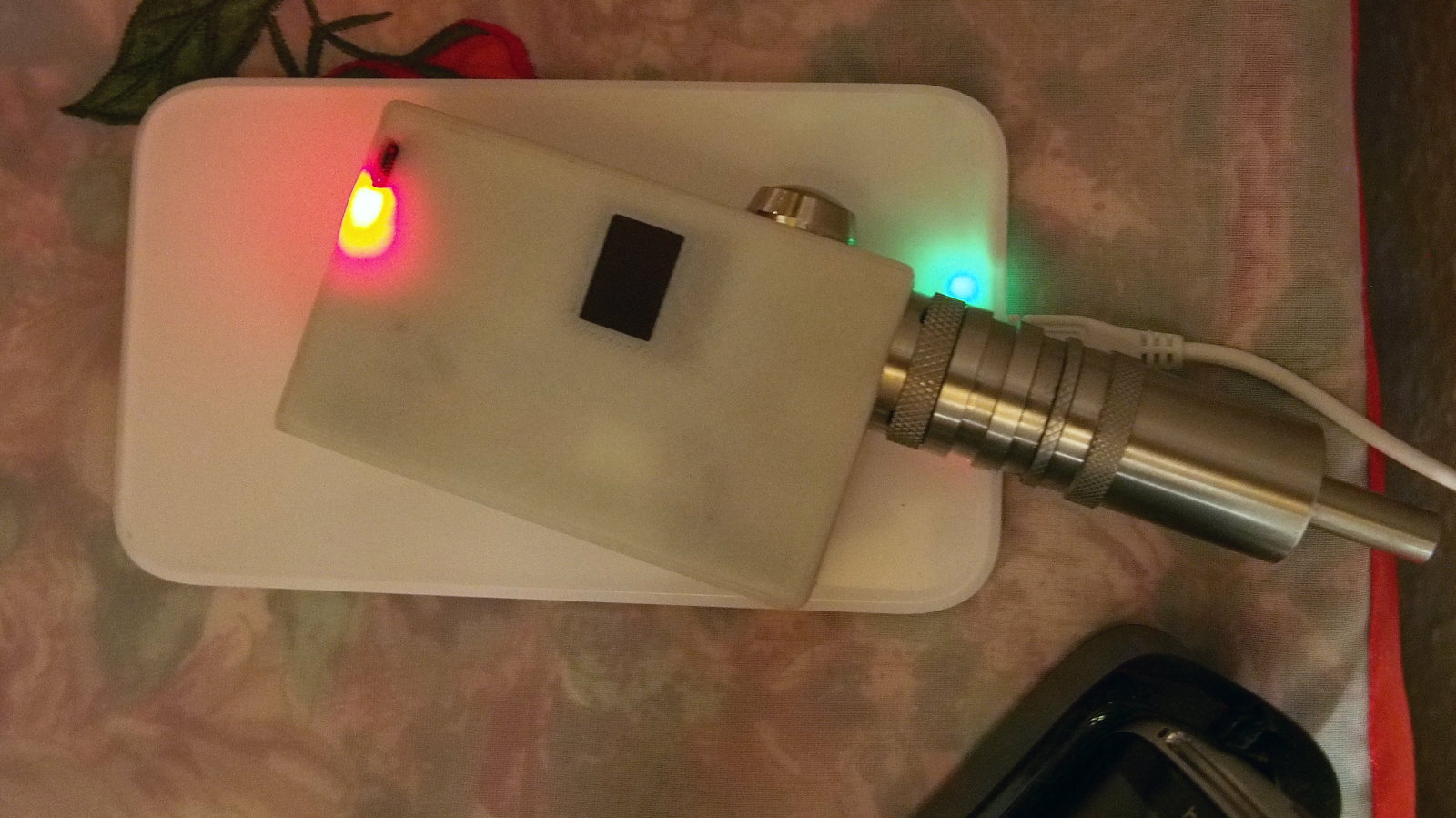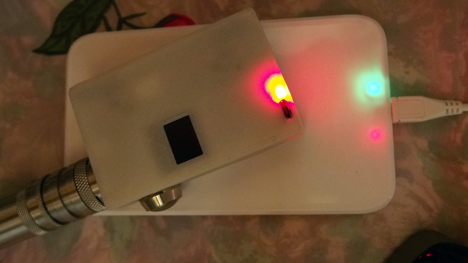 Zum Verkleben des USB-Boards: Nicht notwendig. Nehm ein Stueck Pappe und klemm das USB-Board. Das haelt Bombenfest...hier ein Bild wie ich es gemacht habe und auch wie flexibel man die Power-Perle auf dem Transmitter draufknallen kann damit die QI-Ladung funktioniert (das ganze steht und faellt mit dem USB-Netzteil! 2Ampere sollte es dem Transmitter zur Verfuegung stellen und geladen wird dann der Akku mit 1 Ampere recht flott. Beim erreichen der Schlussladung leuchtet die Power-Perle gruen (das bleibt auch so am leuchten) und die gruene LED des Transmitters schaltet sich aus. Dennoch wird weiterhin ein kleiner Strom fuer die LED der Power-Perle zur verfuegung gestellt):