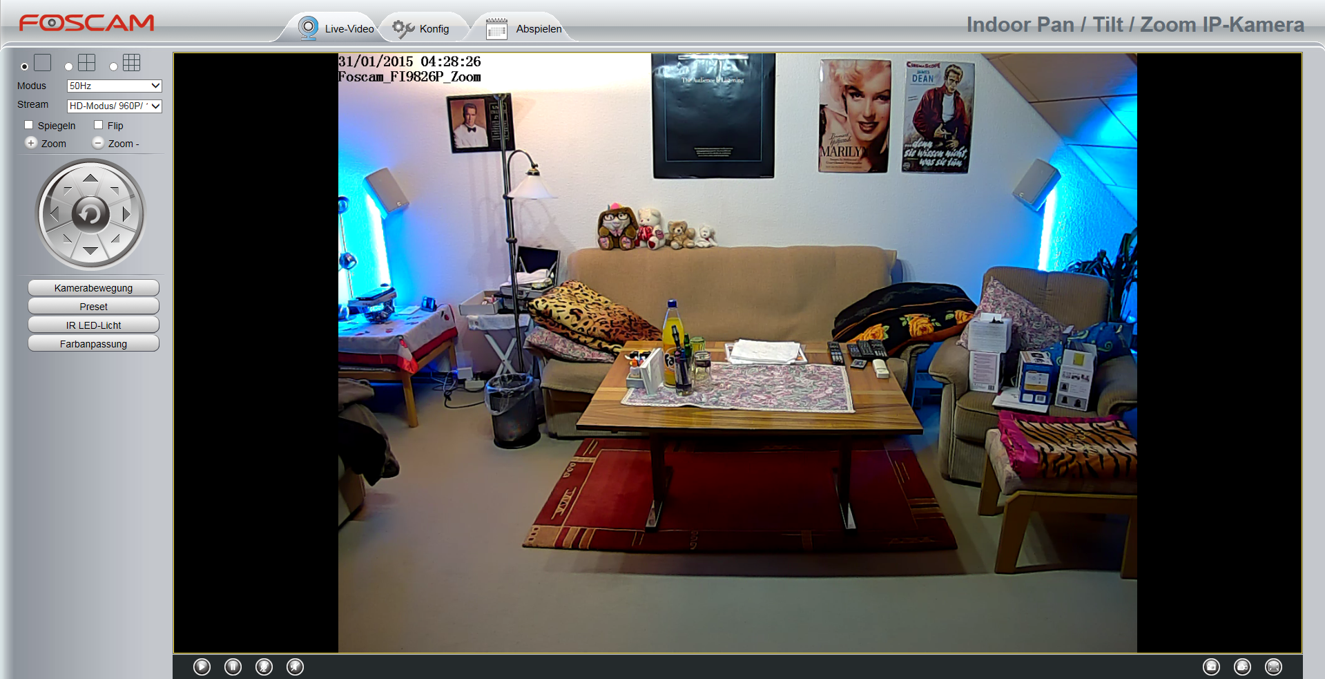 P.S. Uebrigens: Die brandneue Foscam FI9826P laeuft parallel zur anderen Kamera. Hammer dieses Modell: 3Fach optischer Zoom; eine riesige Optik; toller 1,3 MP CMOS Sensor (4Mbit Datenstrom falls gewuenscht) und eine hervorrangende fast schon professionelle Abbildungs-Qualitaet. Einziger Nachteil ist, dass der optische Zoom deutlich hoerbar ist. Hier ein paar Bilder: