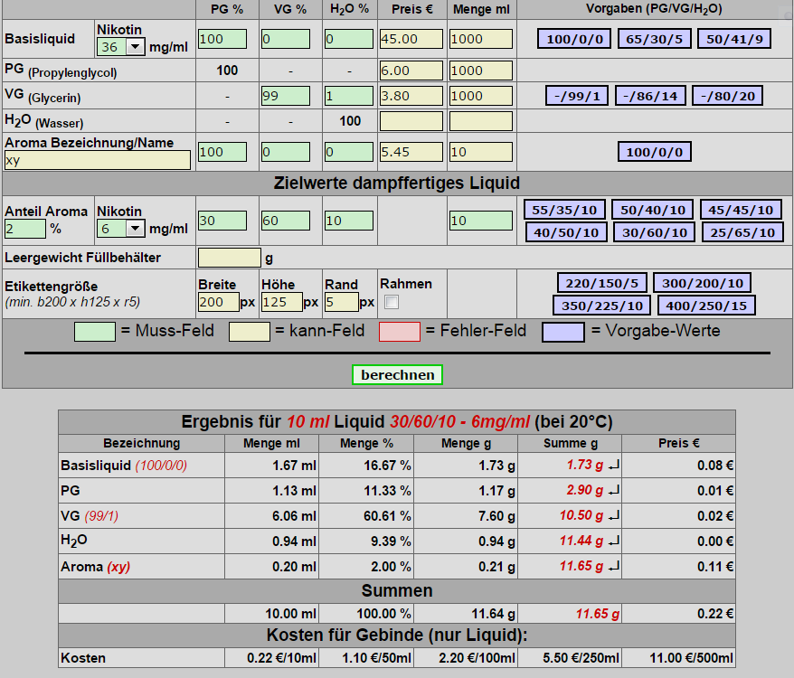 Man sollte auch berücksichtigen, dass man Aromen kauft, die man nicht mehr nimmt weil sie nicht schmecken. Dieses Schmerzensgeld musst Du auch anteilig berücksichtigen. Ein richtiger Kalkulator rechnet anders. Anteilige Kosten von Gefäßen und Verbrauchsmaterial. Auch wenn es in Deiner Freizeit passiert, der Arbeitsaufwand mischen, reinigen von Gefäßen, Spritzen etc. Nimm mal Dein Arbeitsstundenlohn (Brutto) und mal Deinen Aufwand. Kleckerverluste, Schwund etc. zwar sehr gering, aber auf Dauer kostet auch.