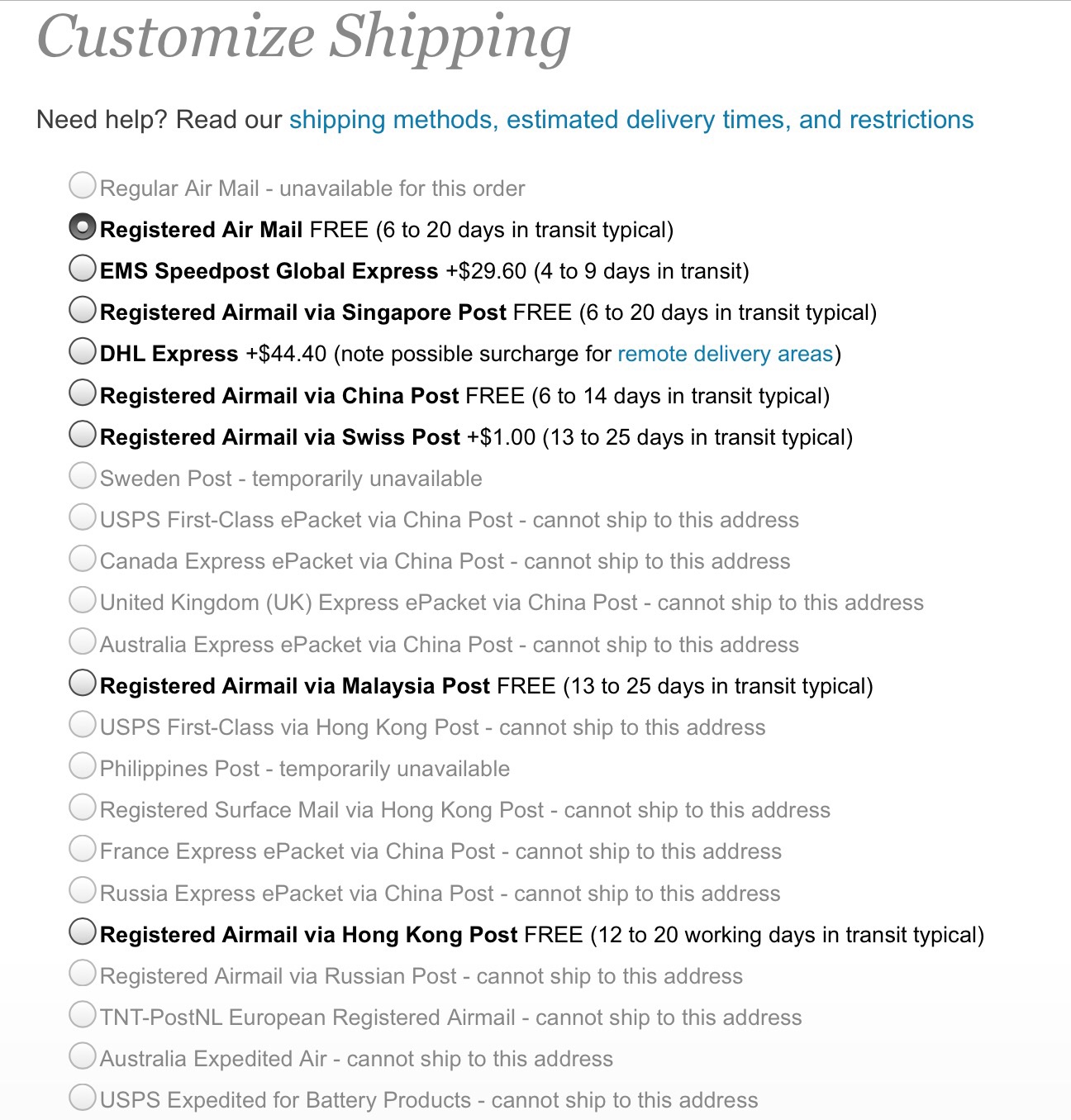 Die Lagergebühr wird erst ab dem 10. Tag der Lagerung fällig! Bei Fasttech kann man auch selbst wählen, mit welchem Versandunternehmen versendet werden soll (sofern es über 20$ ist)! Einfach auf "Show more Options" klicken beim BestellvorgangBPanther hat geschrieben:Das ist bisher das erste Mal, daß ich zum Zoll muß wg. Sendungen aus China. Denke eher, daß es was mit dem Postweg zu tun hat - oder schlicht nur Zufall dieses Mal. Werde ich aber bei der nächsten Sendung sehen, denn leider hat FT da wieder Malaysia gewählt...