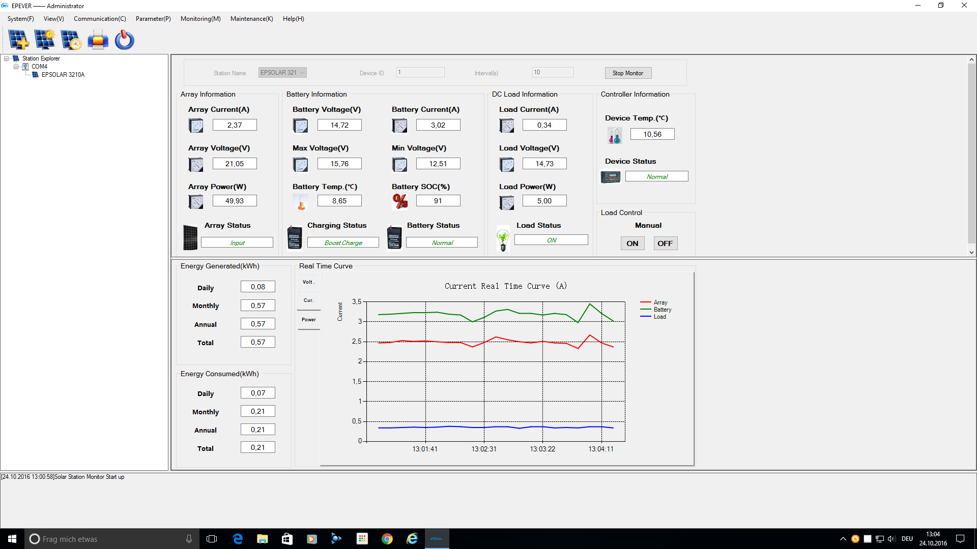 Tag 8 - Endlich....der erste halbwegs gute Tag wo mal die Sonne zu sehen war. Der Akku war dann auch entsprechend geladen als ich mir die Daten mittels Solar Station Monitors mittags bei Sonne welche seitlich eher unguenstig auf die Module traf anschaute. Der Ladestrom lag bei 3A und 0,35 Ampere fuer die Last (Kamera welche seit 1 Woche rund um die Uhr mit eingeschalteten IR-LEDs laeuft also mit maximaler Dauerlast). Um nun die Panels und den Lade-Regler etwas zu fordern bin ich in den Schuppen gewetzt und habe die Beleuchtung ( welche ich am Samstag auf 2 LED-Leisten erweitert hatte ) eingeschaltet und PENG steuerte der EPSOLAR Laderegler hoch auf ca. 85 Watt ( Spannung >20 Volt & >4 Ampere was bei 12 Volt ). Damit haette dann ein Strom von 7 Ampere erzeugt werden koennen von dem der Laderegler die aktiven Verbraucher (Last: Wobei die LEDs und mein DC-DC Board ca. 15 Volt erhielten und das DC-DC Board am Ausgang 12 Volt fuer die Kamera machte) mit >2 Ampere bediente und 3.5 Ampere in den Akku pumpte.