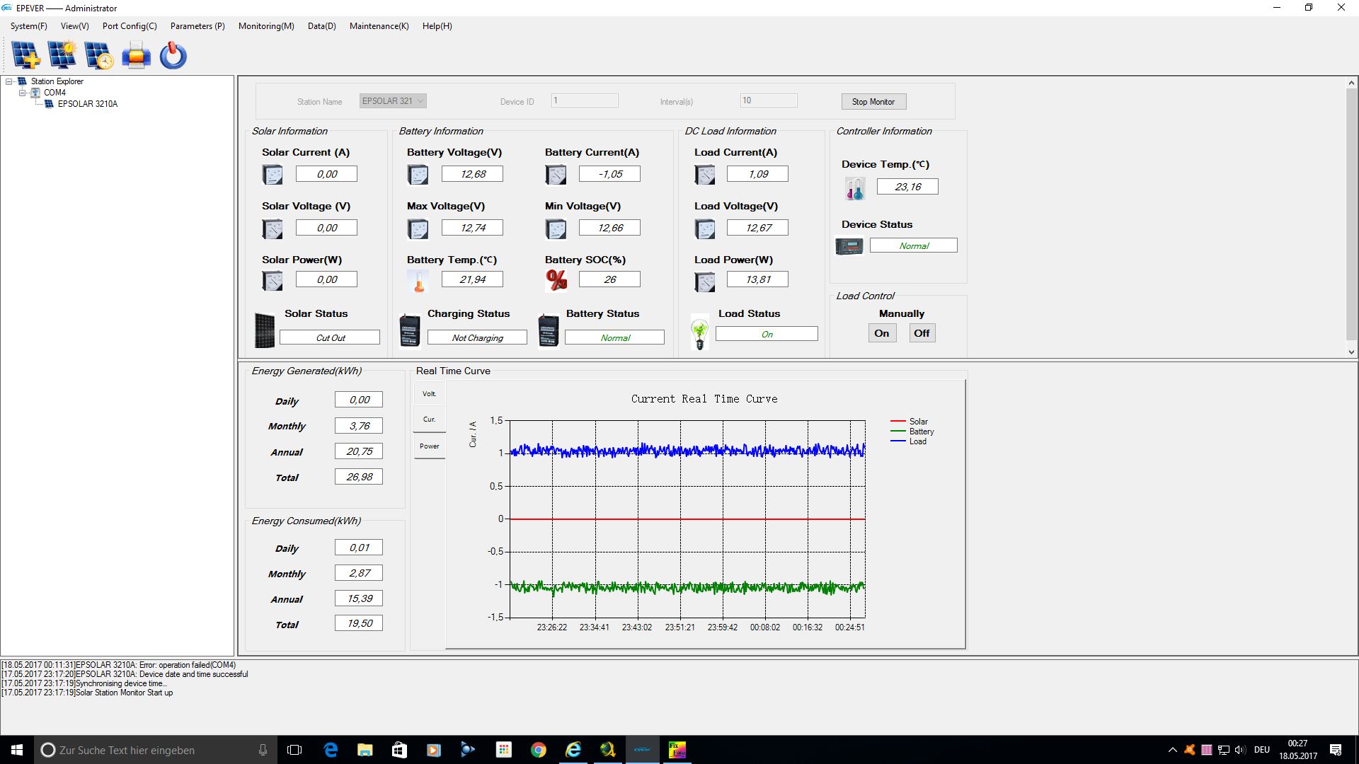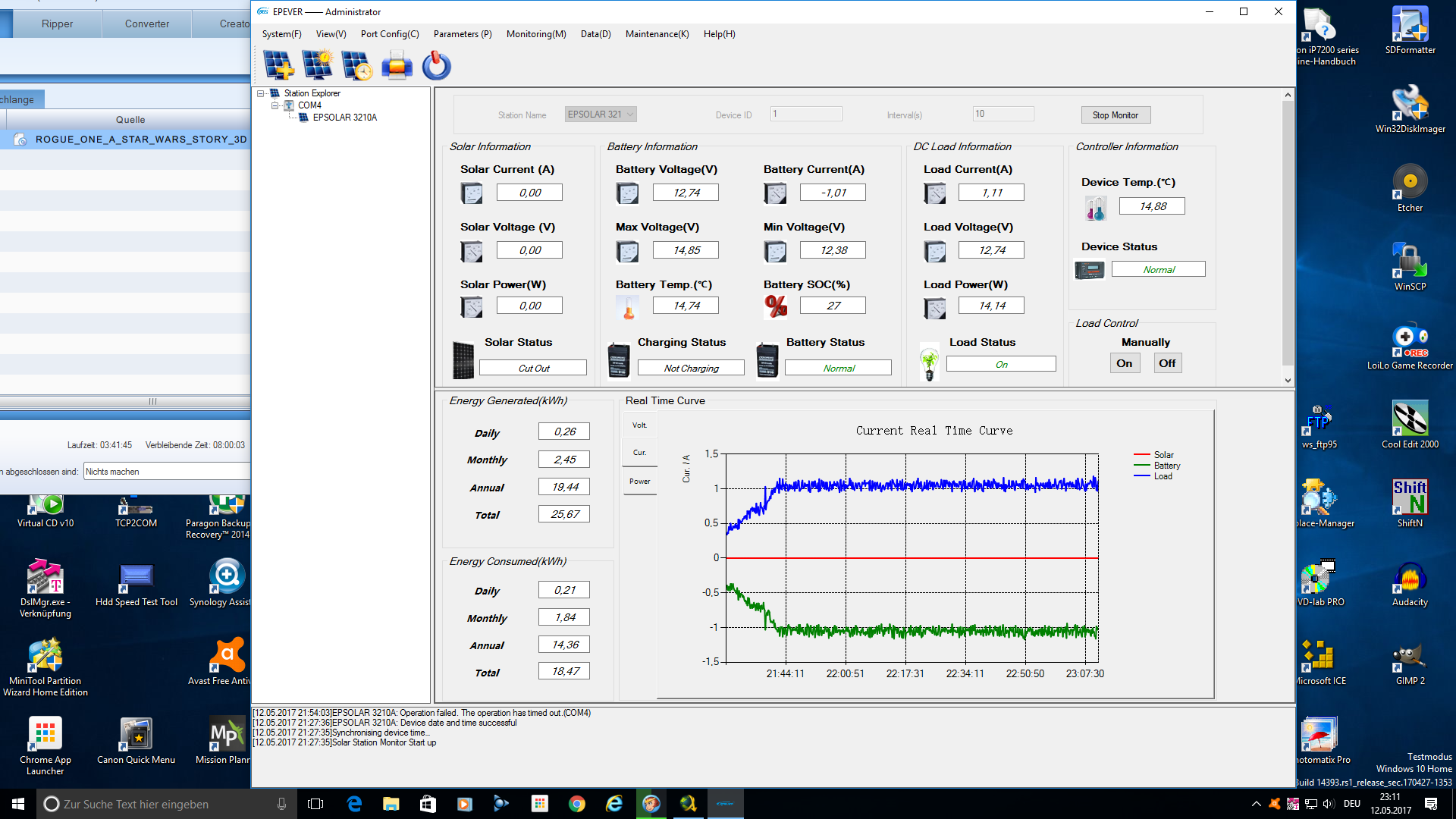 Tag 205 (Freitag, der 12.05.2017)- Also heute zeigte sich das Wetter von seiner durchwachsenen Seite. Es gab alles; leichten Regen; dicke Wolken und gegen Nachmittag kurz sogar mal ein bisschen Sonne. Alles in allem aber kein wirklich toller Tag, eher Mittelpraechtig. Der kleinen Insel-Solaranlage hat das bisschen aber locker gereicht um den 24 Stunden Verbrauch der Last wieder inform von 260Wh frischer gruener Energie aufzufuellen. Wie Ihr in den letzten Beitraegen sehen koennt, gibt es keinerlei Aenderungen im Verhalten der Anlage da mittlerweile immer Ueberschuesse zur Verfuegung stehen.
