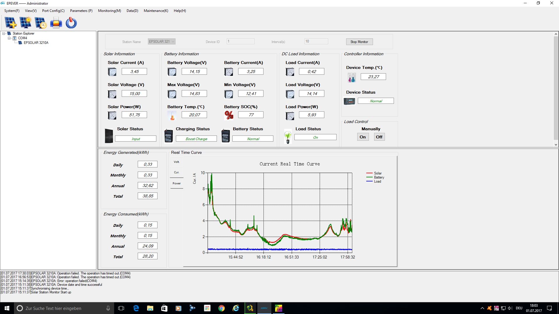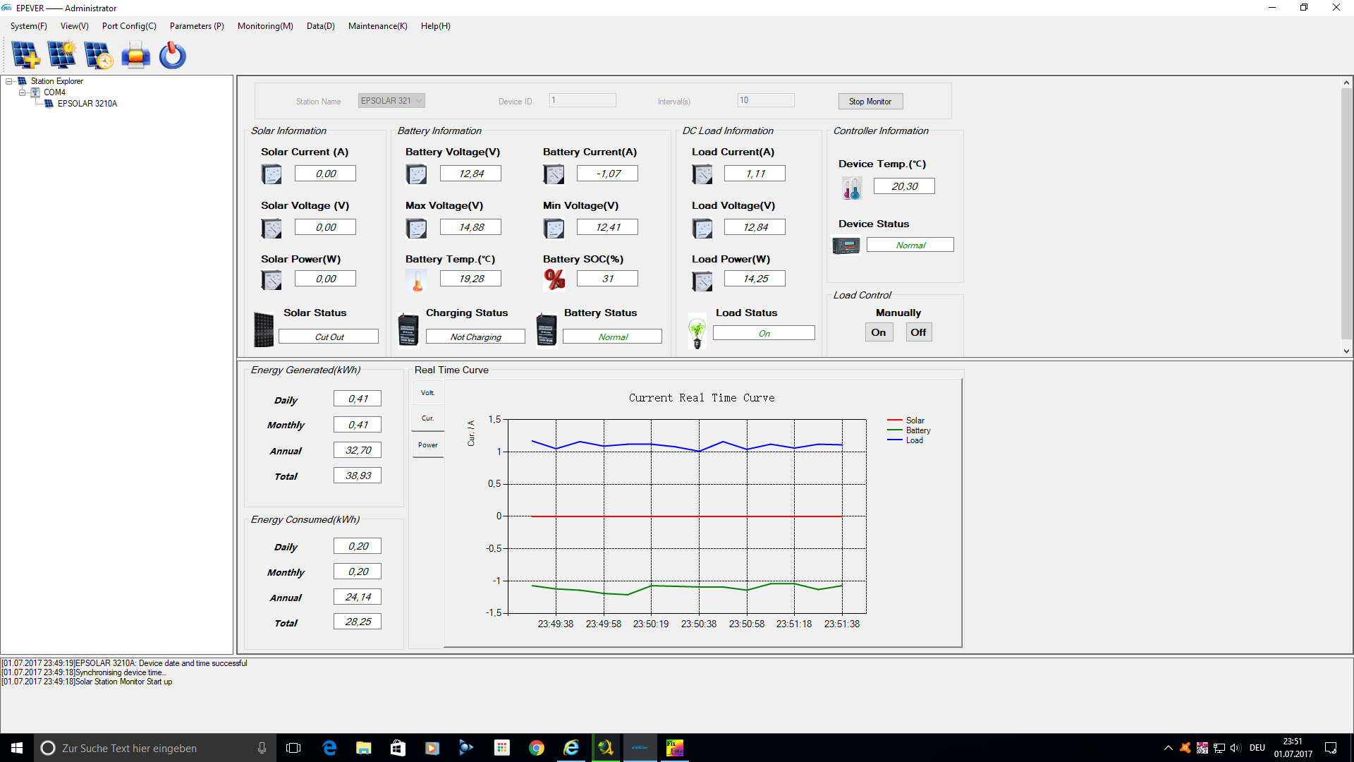 Tag 255 (Samstag, der 01.07.2017)- Bis 13 Uhr Land unter und dann überwiegend Wolkig. Nur kurz kam mal ein bisschen die Sonne durch. Die Insel-Anlage hat aber die Zeit ab 13-14 Uhr genutzt um in Summe 410Wh in die Akkus zu pumpen und hatte die Akkus puenklich gegen Abend tatsaechlich voll bekommen und das Defizit von Gestern wieder kompensiert. Stellenweise kamen knapp 150 Watt resp. 10 Ampere an Ladestroemen von den beiden Modulen (siehe Screenshots unten).