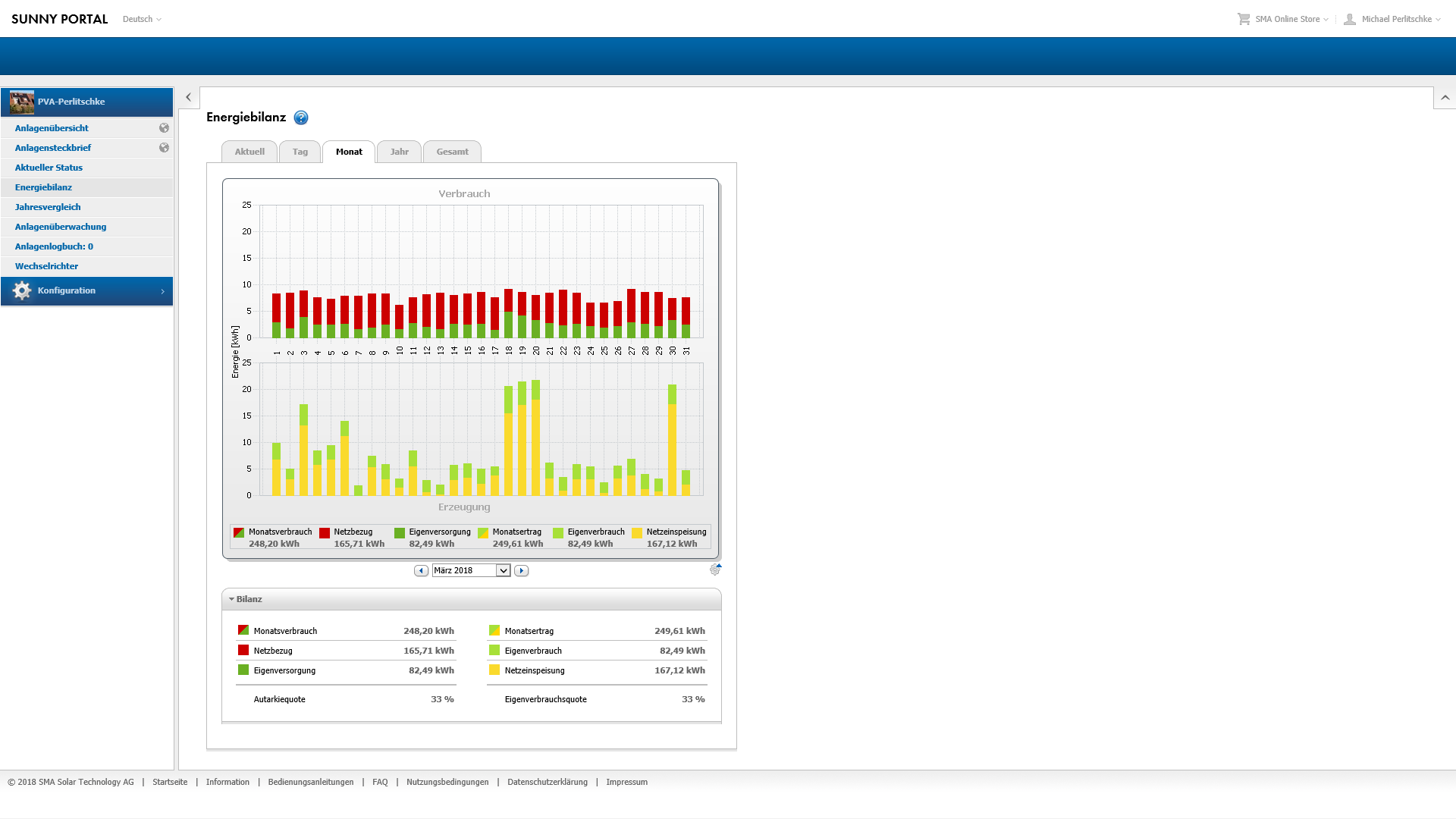 Hier die 4.2kwp Photovoltaik-Anlage auf dem Dach: Wie schon geschrieben gab es im Maerz 6 gute Tage und 25 schlechte. Im Februar ging ich davon aus das ich im Maerz keinerlei Stromkosten mehr habe und die Photovoltaikanlage alle Kosten deckeln wird. Koennte diese auch, wenn das Wetter besser gewesen waere. Aber wenn kaum Strom vom Dach verkauft wird, produziert die Anlage auch keine schwarzen Zahlen. Was bedeutet das nun fuer den kompletten Maerz (31 Produktions-Tage)? In diesem 31 Tagen wurden 249,61kwh an Strom vom Dach geholt. Davon habe ich direkt 82,49kwh selbst verbraucht (nur 33% Autarkiequote) und folglich den Rest ins Netz eingespeisst und 167,12kwh verkauft. Zukaufen musste ich von den Stadtwerken 165,71kwh. Also habe ich an Kosten 165,71*30Cents=49,71 Euro und fuer (167,12* 12,3 Cents) 20,56 Euro eingenommen. Ein Verlust von 29,15 Euro fuer den Maerz 2018 realisiert...