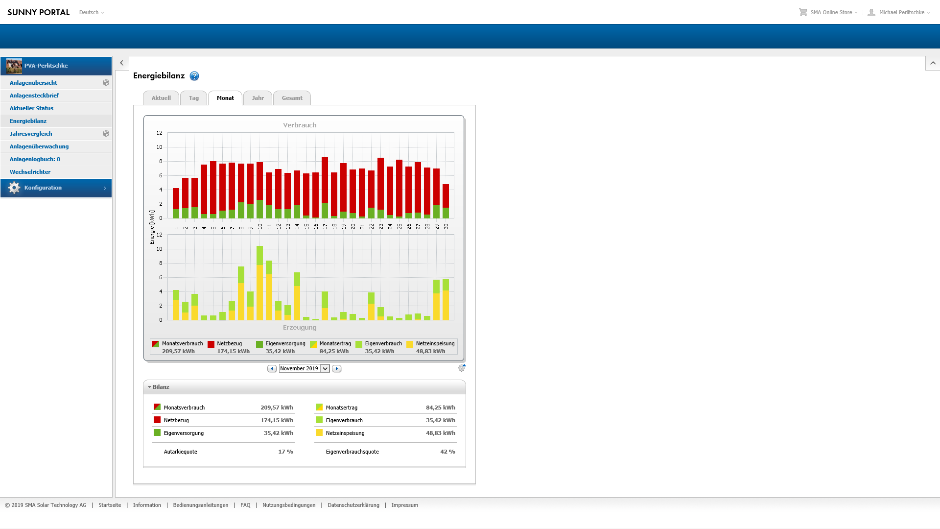 Hier die 4.2kwp Photovoltaik-Anlage auf dem Dach: Nun koennt Ihr Euch sicherlich genau denken was die grosse 4,2kwp Dachanlage geleistet hat. Natuerlich kaum etwas, wenn 21 Tage im Monat dicke schweren Regen-Wolken ueber der Anlage hingen. In diesem Wettertechnisch gruseligen Umfeld hat auch die PV-Anlage auf dem Dach einen neuen MINUS-Rekord erwirtschaftet und den schon schlechten Oktober nochmals massiv nach unten getoppt. Die durchschnittliche Ertragserwartung liegt bei 117,64kwh und vom Dach kamen lediglich 84,25kwh (2017 = 92,23kwh; 2018 = 100,28kwh!!!!). Lediglich schlappe 84,25kwh bei einer Ertragserwartung von 118kwh. AUA, DAS TUT WEH und man koennte weinen, so schlecht war das Ergebnis. Denn es entspricht einem ungeplanten Ertrags-Minus von brutalen 28,4% zur durchschnittlichen Ertragserwartung. Ein für den November vernichtendes Ergebnis, wobei der Vormonat mit 33% aber noch schlechter war. Dennoch ist das alles in Anbetracht der ohnehin geringen Wirtschaftlich dieses Monats (selbst bei idealen Wetterbedingungen) durch zu verschmerzen. Aber schaut einfach selbst: