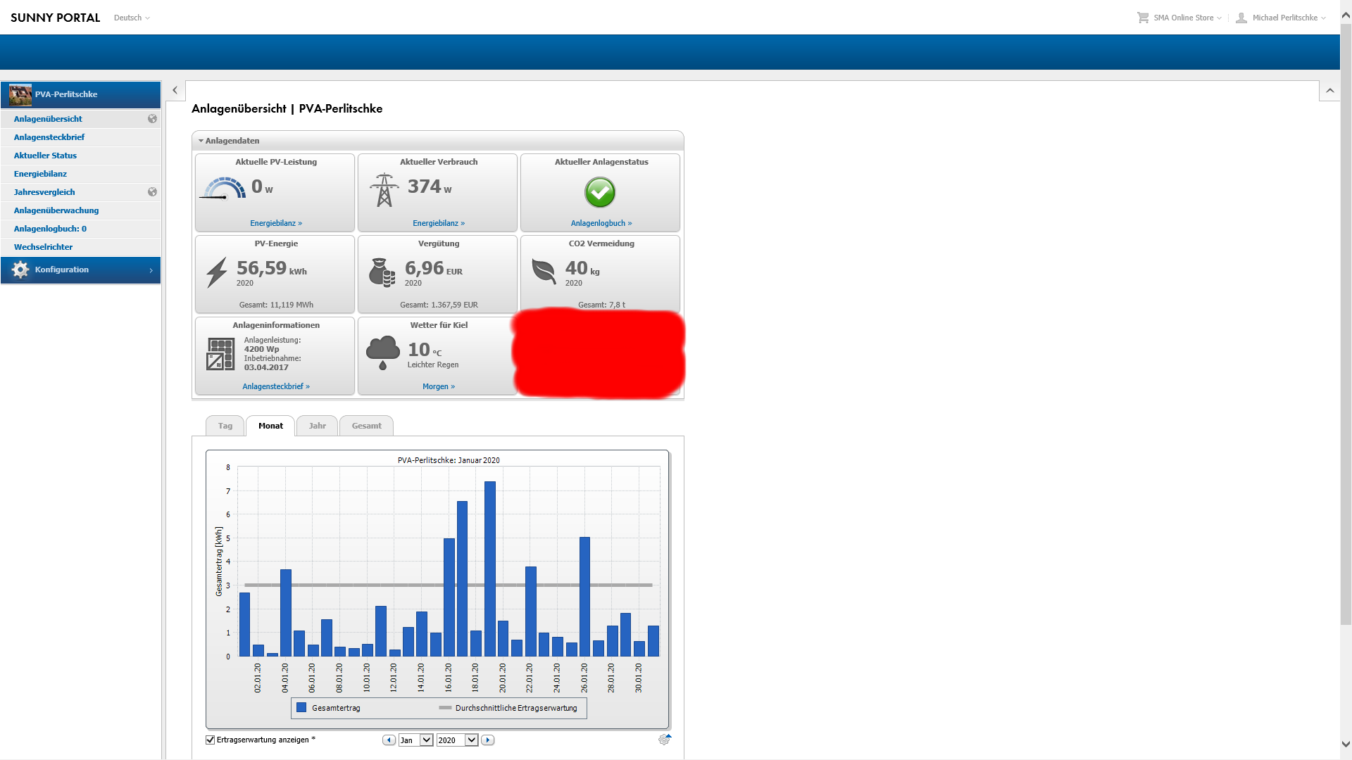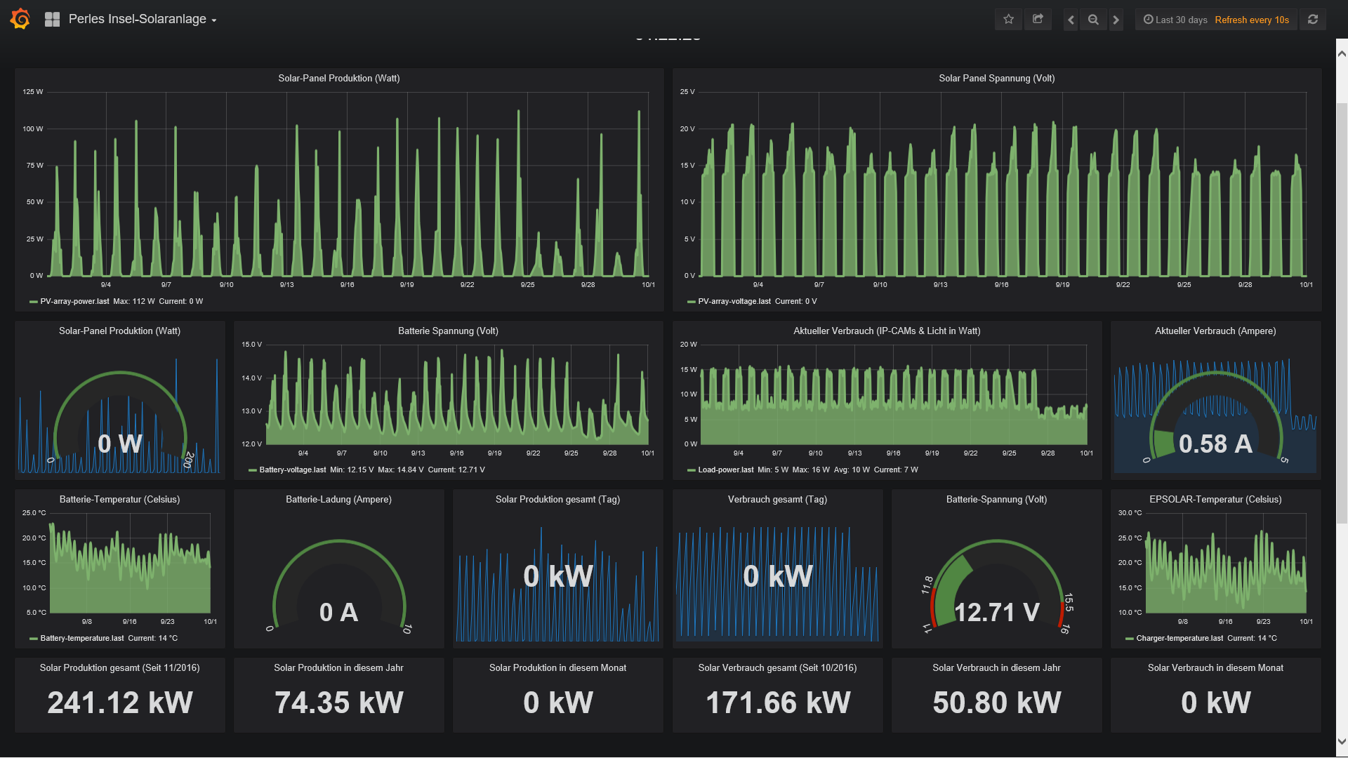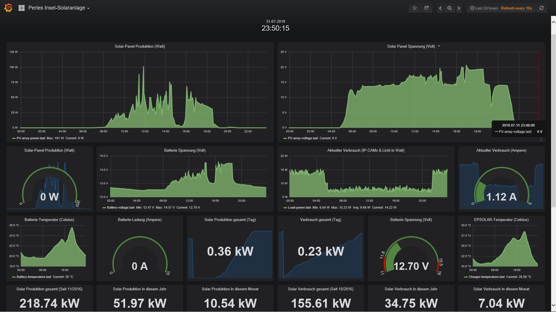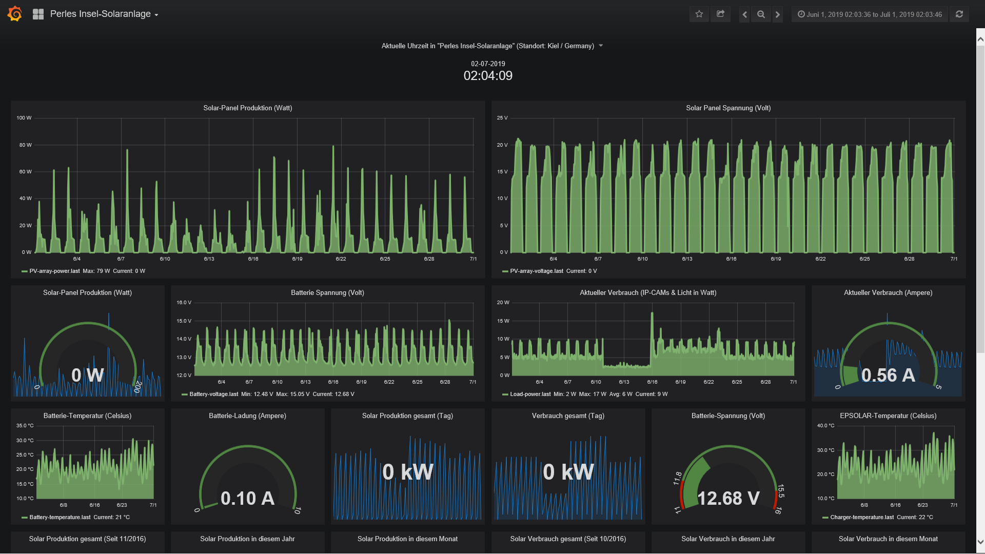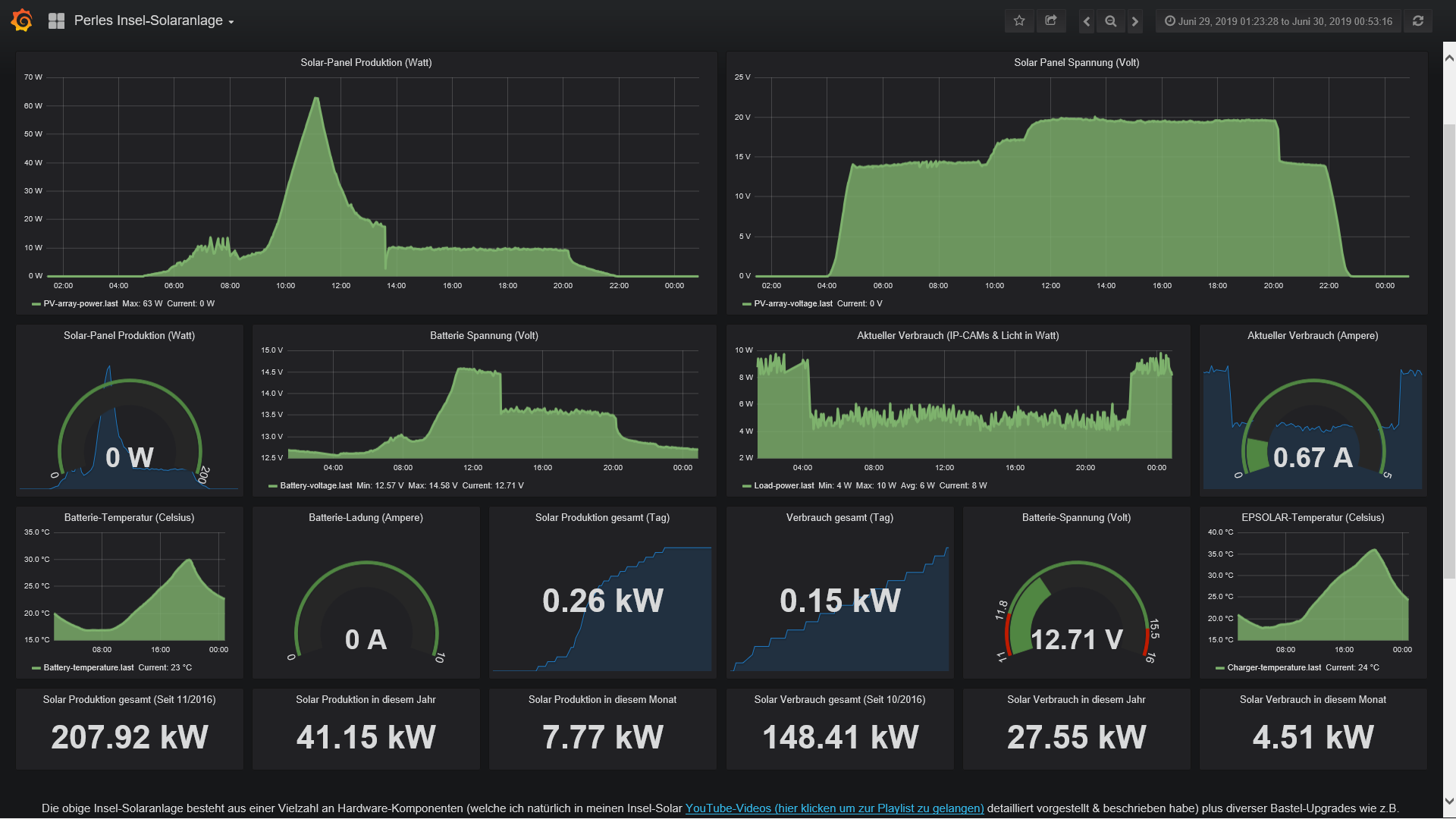 Auch wenn ich aufgrund der Forums-Schliessung mitte Januar 2020 absolut keinen Anlass und Sinn mehr sehe, das weiterhin oeffentlich zu supporten, werde ich den Link ab dem 15 Märtz wieder oeffentlich zugaenglich machen und die Anlage ins Netz stellen. Grund: Januar; Februar und Maerz waren fuer die Insel-Anlage keine guten Monate. Dennoch lief die Anlage natuerlich, aber der Raspberry Pi als Server und Logger war OFFLINE um Strom zu sparen.
