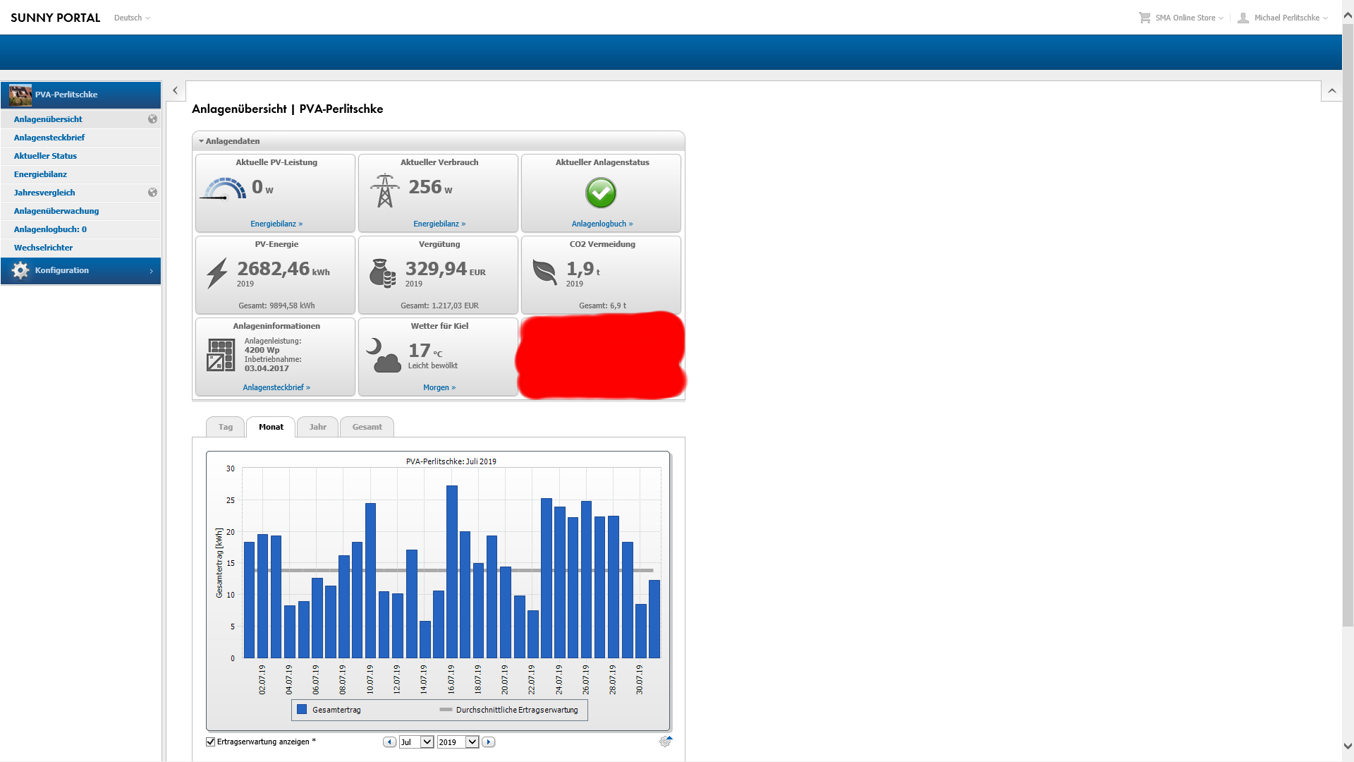 Hier die 4.2kwp Photovoltaik-Anlage auf dem Dach: Jetzt wird es spannend, denn nun kommen wir wieder zur 4,2kwp Dachanlage und was diese so geliefert hat. Bis zum 22 Juli dachte ich eine Ertragsbauchlandung zu generieren. Aber da der Juli in den letzten 9 Tagen des Monats Vollgas gegeben hat, war das Ergebnis dann doch besser als erwartet. Die durchschnittliche Ertragserwartung fuer den Juli lag bei 427,33kwh. Es wurden aber 504,02kwh vom Dach geholt. Somit lag die Anlage 15kwh über dem Ergebnis des Jahres 2017 und 157kwh unter dem Rekord-Ergebnis von 2018 (In diesem 2018er Dürre-Monat schien fast nur die Sonne). Lange Rede kurzer Sinn: In diesem Juli lag die Anlage ca. 18% ueber der Projektion. In Anbetracht des Monats und der Wetter-Situation ein respektables Plus also gutes Juli-Ertrags Ergebnis.