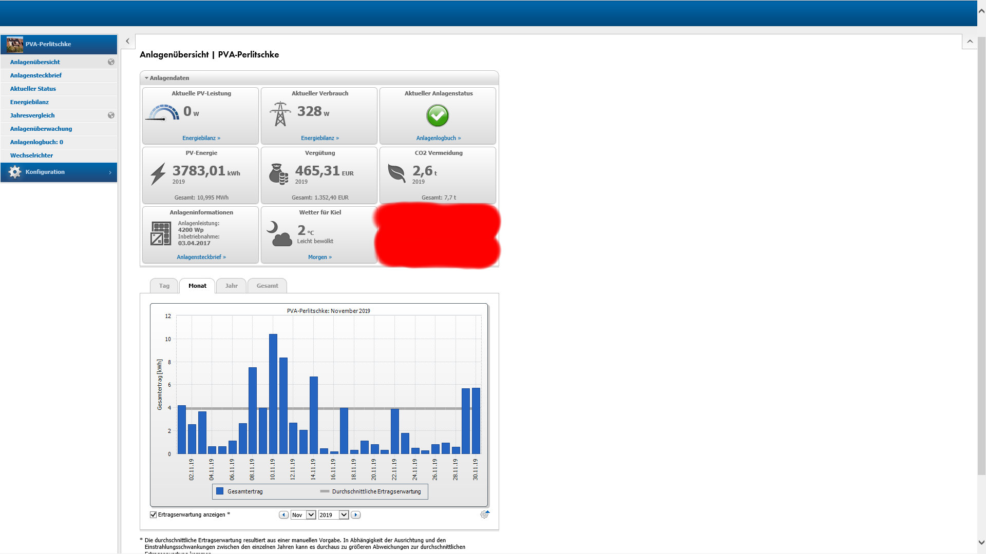 Hier die 4.2kwp Photovoltaik-Anlage auf dem Dach: Nun koennt Ihr Euch sicherlich genau denken was die grosse 4,2kwp Dachanlage geleistet hat. Natuerlich kaum etwas, wenn 21 Tage im Monat dicke schweren Regen-Wolken ueber der Anlage hingen. In diesem Wettertechnisch gruseligen Umfeld hat auch die PV-Anlage auf dem Dach einen neuen MINUS-Rekord erwirtschaftet und den schon schlechten Oktober nochmals massiv nach unten getoppt. Die durchschnittliche Ertragserwartung liegt bei 117,64kwh und vom Dach kamen lediglich 84,25kwh (2017 = 92,23kwh; 2018 = 100,28kwh!!!!). Lediglich schlappe 84,25kwh bei einer Ertragserwartung von 118kwh. AUA, DAS TUT WEH und man koennte weinen, so schlecht war das Ergebnis. Denn es entspricht einem ungeplanten Ertrags-Minus von brutalen 28,4% zur durchschnittlichen Ertragserwartung. Ein für den November vernichtendes Ergebnis, wobei der Vormonat mit 33% aber noch schlechter war. Dennoch ist das alles in Anbetracht der ohnehin geringen Wirtschaftlich dieses Monats (selbst bei idealen Wetterbedingungen) durch zu verschmerzen. Aber schaut einfach selbst: