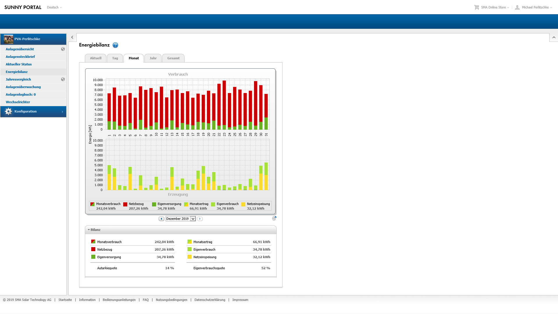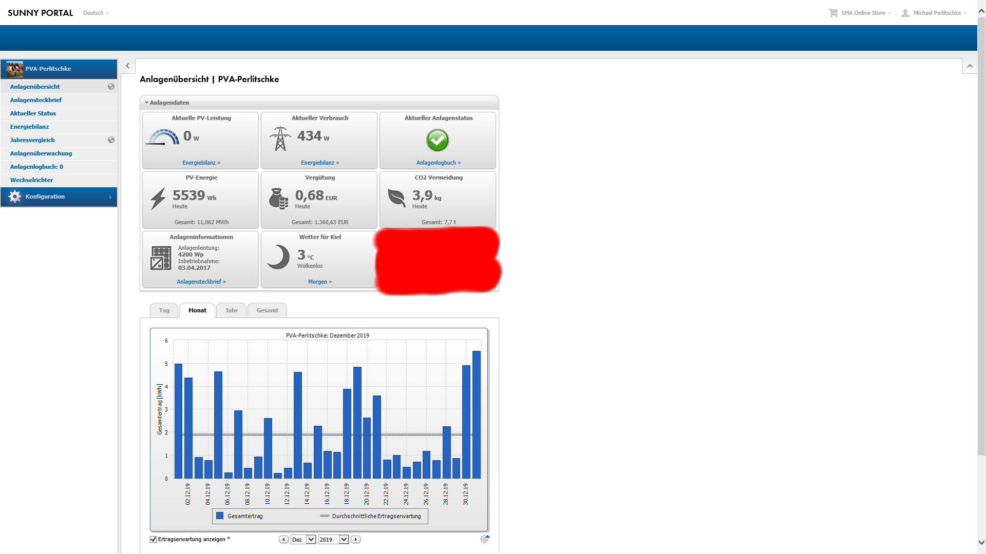 Hier die 4.2kwp Photovoltaik-Anlage auf dem Dach: Wir alle wissen mittlerweile das es faktisch egal ist ob und wieviel vom Himmel an Sonne auf die 4200 Watt Solar-Panel faellt, da die durchschnittliche Ertragserwartung im Dezember tief im Keller bei nur 58,99kwh liegt. Im Jahr 2017 hat die Anlage unter Projektion nur 50,19kwh produziert und letztzes Jahr 2018 kam nur 38,21kwh vom Dach (das Jahr 2018 war unglaublich, aber im Dezember echter und totalschaden). Dieses Jahr 2019 glaenzte der Dezember mit fuer mich ueberraschenden 66,91kwh, also 11,3% ueber Projektion. WOW....geil, aber auf das Beschriebwirtschaftliche Ergebnis haben so geringe Ertraege wahrlich keinen Einfluss...