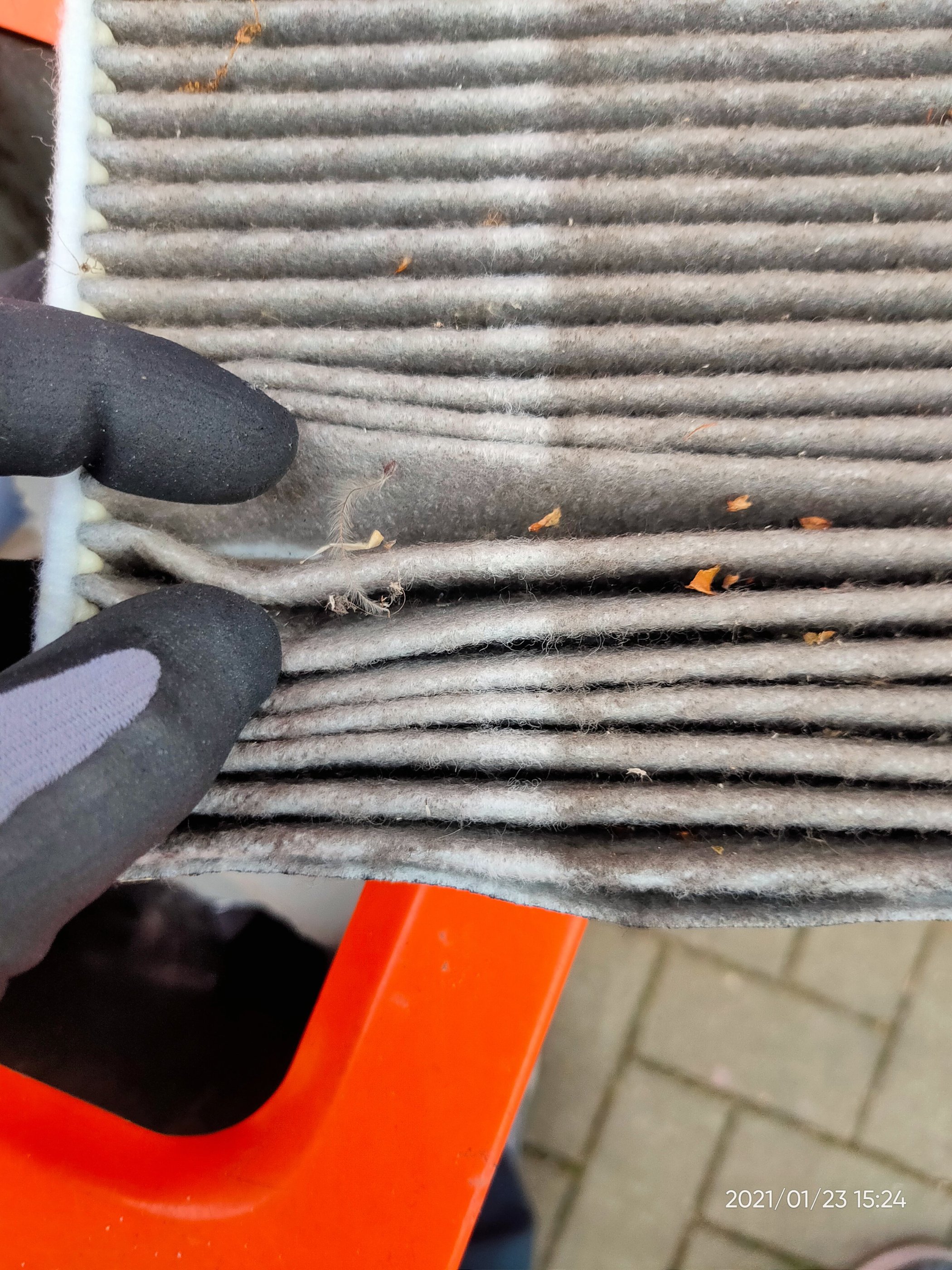 Beim Ausbau des alten kam dann auch die optische Bestätigung. Der "MANN FILTER Pollenfilter mit Aktivkohle FP 2433" sah übel aus und war total verdreckt. Kein Wunder das der nicht mehr korrekt arbeitet (was sicher auch für die von mir geliebte Aktivkohle gilt). Hier ein paar Bilder vom ausgebauten Filter und meine Empfehlung (ich hatte vor 13 Monaten versprochen diese Info nachzureichen) diesen 1 mal im Jahr (ca. 15-17 Euro) unbedingt zu wechseln.