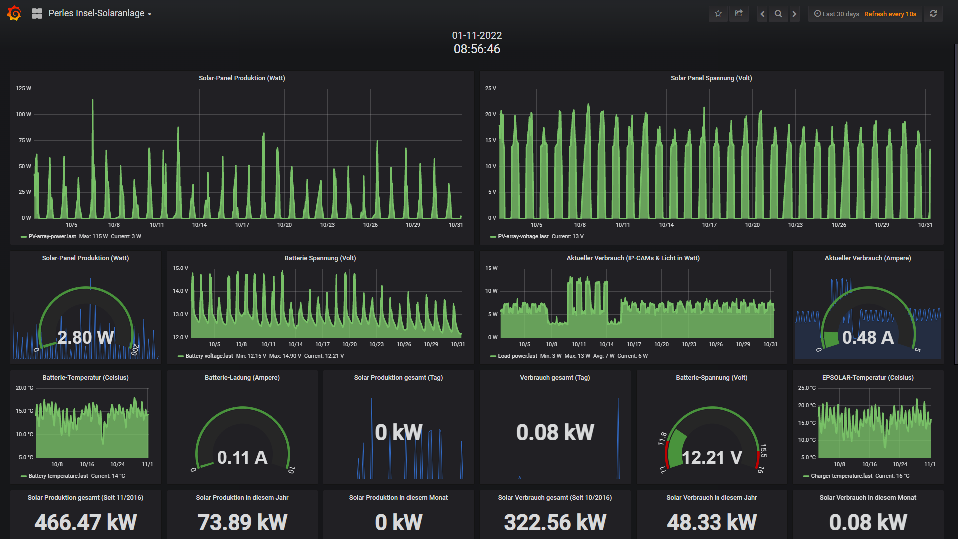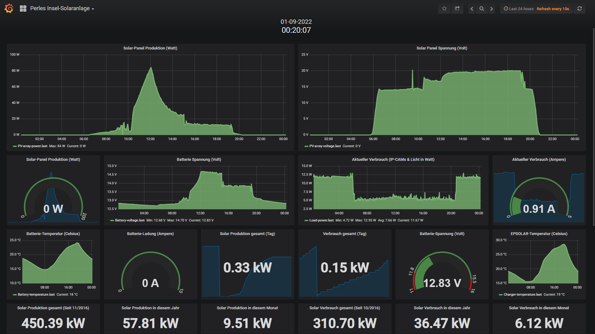 Die kleine 200 Watt Insel-Solaranlage: Wie zu erwarten lief die Anlage trotz merklich kürzer werdenden Tage und immer ungünstiger stehendender Sonne problemlos durch. Da aber in der letzten September-Woche fast nur Regen und dicke Wolken am Start waren, bediente sich die Insel-Anlage ueber die eingelagerte 200Ah Akku-Power und lutschte die Energie stetig weg ohne das nennenswert nachgefuellt wurde. Also beschloss ich 4 Tage vor Ende des Monats bei 12,23 Volt das Infrorot-Flutlicht zu deaktivieren, was bedeutet das Nachts (bei immer länger werdenden Nächten) anstatt 12 Watt nur noch 7 Wh verbraucht wurden. Und das Flutlicht bleibt nun bis Maerz 2023 deaktiviert. Irgendwann im November wird es dann auch noetig die Kamera temporaer (wenn ich zuhause bin) zu deaktivieren. Aber das alles kennen wir ja schon von den letzten 6 Jahren. Fazit: Noch laeuft alles unter Last sauber (bis auf das IR-Flutlicht) und Stoerungsfrei automatisch nach Plan!