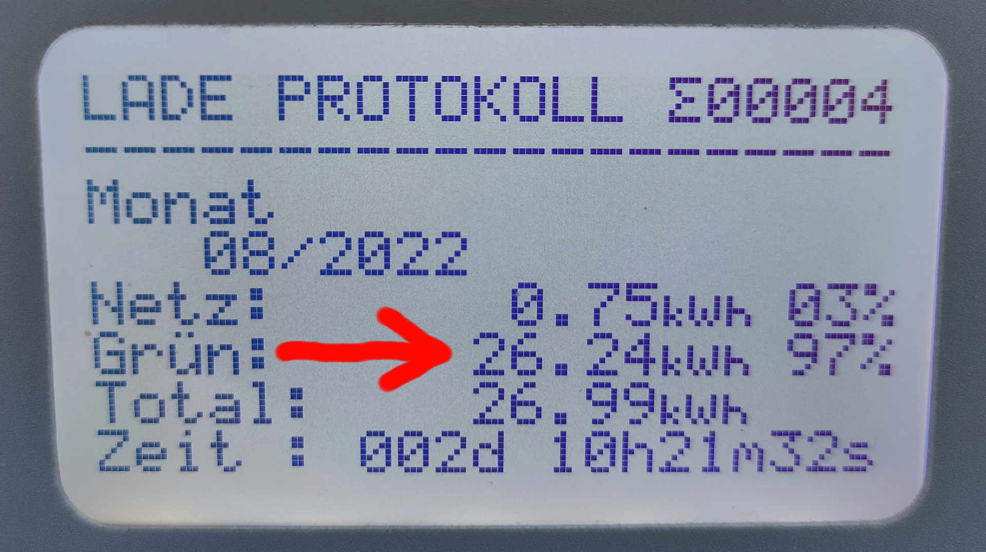 Diese vom SMA als Netzeinspeisung erfasste Energie muss nun mit der von der Zappi gemessenen und genutzten Energie (ins E-Auto umgeleiteten) entsprechend reduziert werden. In obigen Beispiel also 26,24kwh die NICHT verkauft wurden, sondern als zusätzlicher grüner PV Strom dem Eigenverbrauch angerechnet werden muss! Und diese 26,24kwh muss auch von der Netzeinspeisung abgezogen werden, damit wieder alles korrekt gerechnet werden kann. Siehe nächsten Absatz...