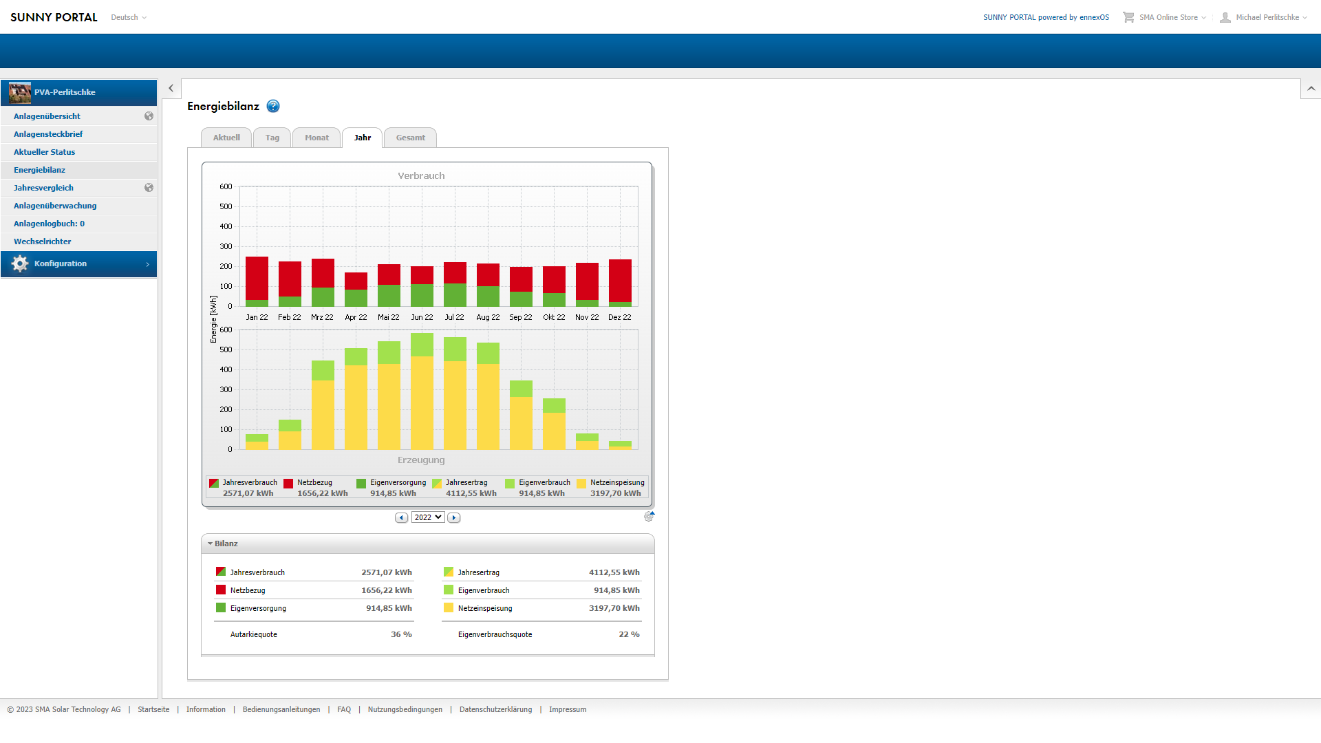 Es stehen noch 3 Monate für das 6te Produktionsjahr aus. Da kann noch richtig viel passieren und es ist alles möglich. Stand jetzt ist das die Anlage im 6ten Produktionsjahr dramatisch und auch erfreulich über den Erwartungen produziert hat. Wie war denn die Performance auf das Jahr 2022 (Januar-Dezember) separiert betrachtet. Die Jährliche Ertragserwartung liegt bei 3351,60kwh. Produziert hat die Anlage im Jahr 2022 satte 4112,55kwh. Das ist ein Rekord und liegt auf gleicher Höhe mit der Produktion der Jahre 2018 & 2020. Also ganz grosse Klasse, da kann man sehr zufrieden sein denn viel besser geht es kaum (man bedenke die West/Südausrichtung und auch das die Anlage hoch im Norden Deutschlands operiert).