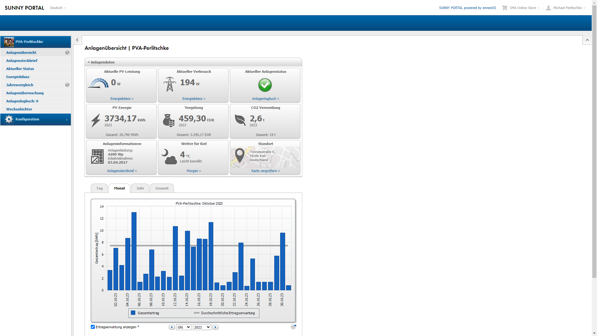Hier die 4.2kwp Photovoltaik-Anlage auf dem Dach: Und hier wären wir nun wieder bei der kleinen 4,2kwp Dach PV Anlage und dem Oktober-Ertrag. Habe ich Ertrag geschrieben? Diesen verregneten Monat kann man komplett vergessen, denn wirklich viel kam da nicht vom Dach. Die Ertragserwartung für den Oktober lag bei 230,93kwh und vom Dach kamen nur erbärmliche schwer zusammengesammelte 153,64kwh. Das ist seit Inbetriebnahme 2017 ein absoluter Negativ-Rekord. Verrückt denn einen Monat zuvor gab es noch einen neuen Rekord und diesen Monat genau das Gegenteil. 2019 war der Oktobetr auch schlecht, aber dieser toppte nach unten wirklich alles. Das entspricht diesen Monat einem gigantischen Minus von 50,3% gegenüber der Ertragserwartung. Dieser Oktober war leider komplett vernichtend. Zu den Details mehr in diesem Screenshot: