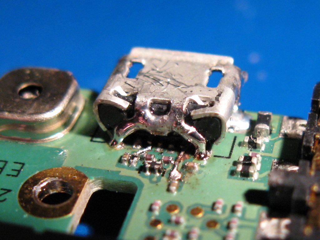 8.) Nachdem nun alle 5 Pins wieder elektrisch Kontakt mit dem Mainboard des HD2 besitzen, wenden wir uns nun der Fixierung des USB-Connectors zu. Dieser wird mittels 4 Masse-Pins ( zwei vorne und zwei hinten ) an der Hauptplatine gehalten, sodass man diese nur mit Roher brachialer Gewalt (was ja ??brigens auch zu unserem Problem gef??hrt hat) rausreissen. Mit dem L??tkolben nun unter Zugabe von frischen Zinn diese Masse-Halteverbindungen in die Hauptplatine einschmelzen. Da eine Menge W??rme in das USB-Metallgeh??use abwandert muss man an den Stellen etwas L??nger Hitze zuf??hren bis die Durchkontaktierungen homogen aufschmelzen und die Masse-Pins sich mit der Hauptplatine l??ttechnisch sauber verbinden. Auf der Seite mit dem Mirophone muss man nicht sonderlich aufpassen. Auf der andere Seite bitte auf den recht dicht sitzenden grossen Widerstand achten...IMHO ist das aber mit der Bleistiftl??tspitze sehr einfach. Nachdem wir vorne fertig sind, f??hren die Prozedur auch an den hinteren beiden Masse-Halterungen durch...