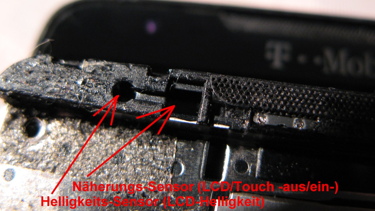 Der etwas groessere fast quadratische Lichtleiter ist verantwortlich fuer den Naeherungs-Sensor. Haelt man das Telefon an den Kopf, registriert das dieser Sensor und schaltet das LCD-Display und die Touchscreen-Funktionenen komplett aus um eine versehentliche Fehlbedienung ( mit der Wange z.B. auflegen etc.p.p. ) des HD2 bei einem Telefonat auszuschliessen. Entfernt man einen gegenstand wie den Kopf wieder, wird das Touchscreen und LCD eingeschaltet, sodass man das HD2 wieder ganz normal bedienen kann...