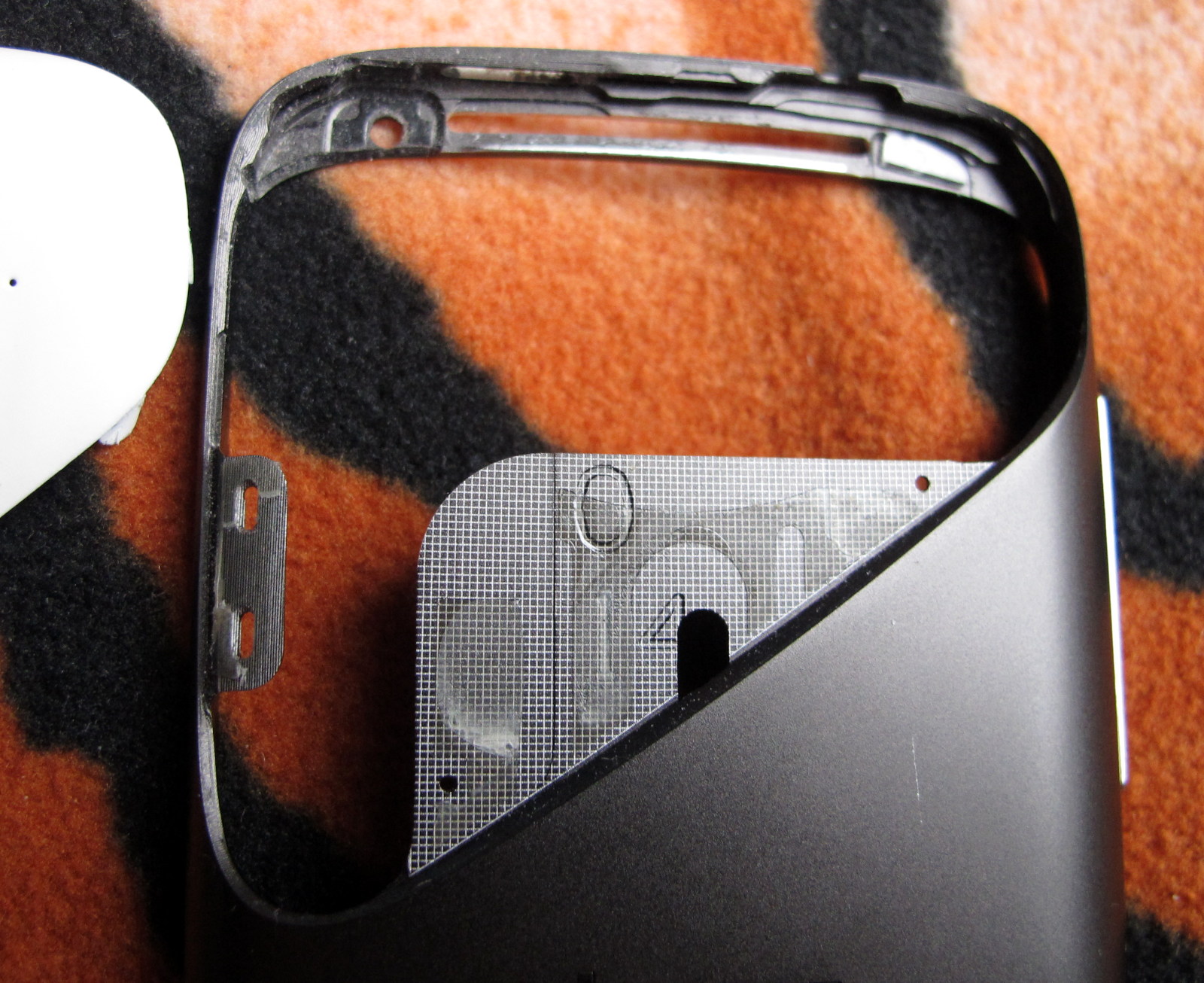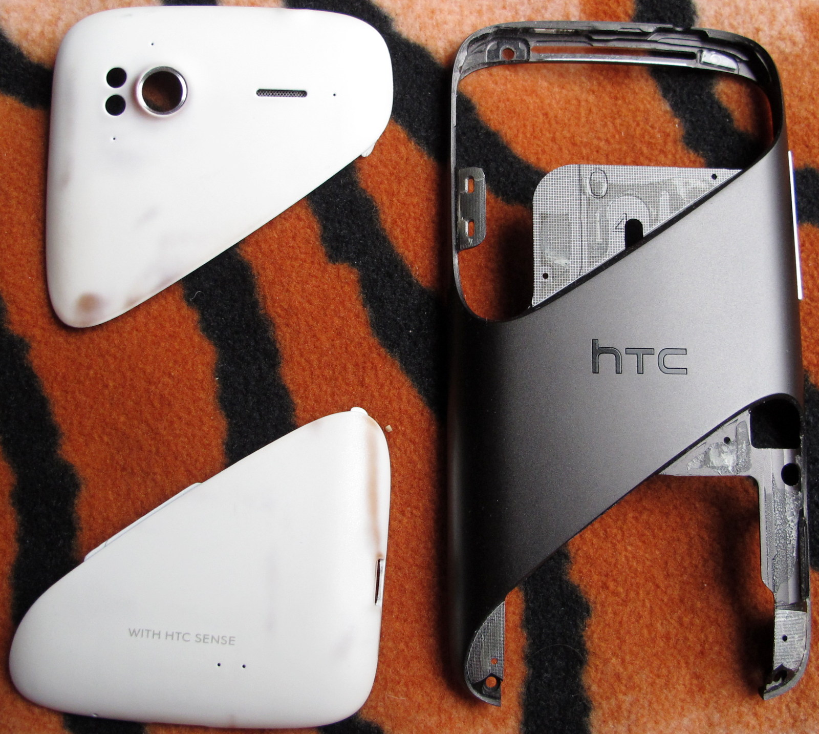 In dieses Alu-Gehaeuse habe ich dann aus einem normalen Sensation mit verbeulten dunklen Unibody-Gehaeuse die beiden noch guten Antennen-Abdeckungen eingebaut.
