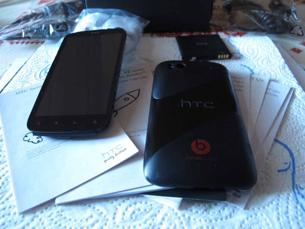 HTC SENSATION XE aber ohne die Dr.Dre Beats InEar Kopfhoerer liegen. Android 4.2.2 vom 4 August 2013 ist installiert; alles brutal schnell; optisch huebsch ( so man das rote XE-Design mag ) und wertig; leistungsstark; hochausfloesend und ohne Kratzer ( nur das fuer kleines Geld austauschbare Unibody hat oben rechts eine kleine Macke im schwarzen Alu. Wer mag kann auch ein Nagelneues Sensation Unibody bekommen ) im Gehaeuse; Zubehoer oder dem Touchscreen. Vom Zustand her also fast wie frisch aus der Fabrik. Funktioniert natuerlich auch einwandfrei...