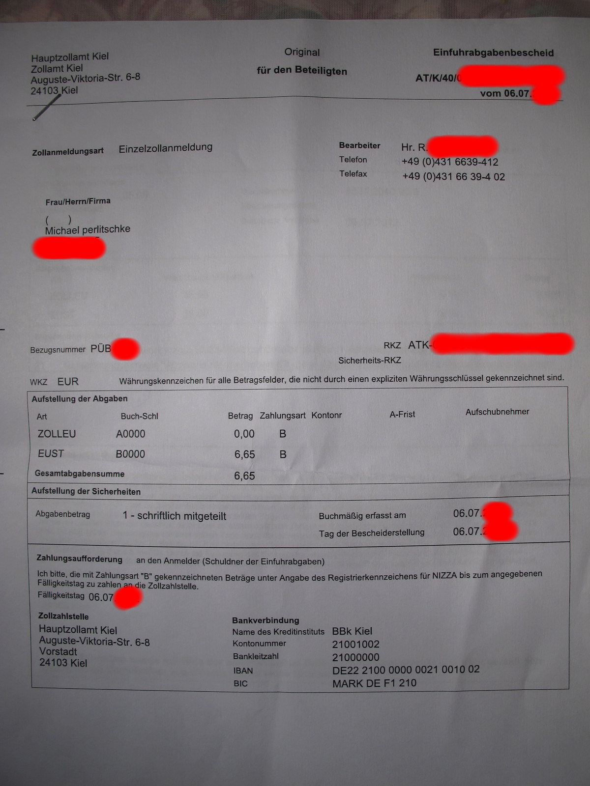 Sollte der Warenwert >26 Euro liegen, geht man zur Zoll-Kasse und zahlt ein paar alberne Euro Maerchensteuer (19%); und rennt mit dem Zahlbeleg wieder zum Zoellner und nimmt die Ware dann mit. Das ist oftmals so dermassen wenig das man den Kopf schuetteln muss, denn das kann sich vom Arbeitsaufwand ( Zeil = Lohn ) kaum fuer die Burschen rechnen und ist dann ein Nullsummenspiel fuer Vater Staat...
